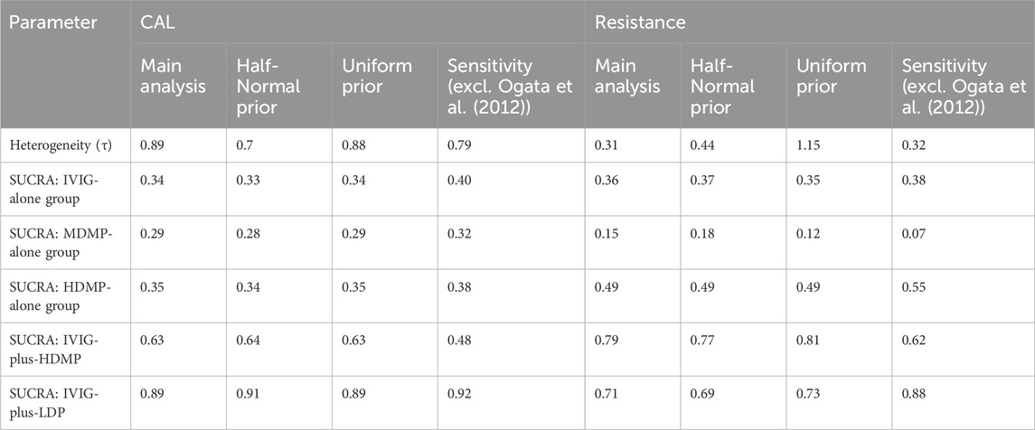 The key findings from the main and sensitivity analyses are summarized in Table 3 below for the outcome, with consistent results. The results remained consistent across different weakly informative prior distributions for the heterogeneity parameter, including Half-Normal(0,1) and Uniform(0,5) priors, indicating the robustness of the outcomes to prior specifications. Furthermore, A sensitivity analysis was conducted by excluding the study by Ogata et al. (2012), which uniquely enrolled patients predicted to have refractory KD based on the Egami score. This exclusion led to some fluctuations in the SUCRA rankings. Most notably, for the outcome of resistance, the SUCRA value for IVIG-plus-LDP increased from 0.71 to 0.88, while that for IVIG-plus-HDMP decreased from 0.79 to 0.62.
