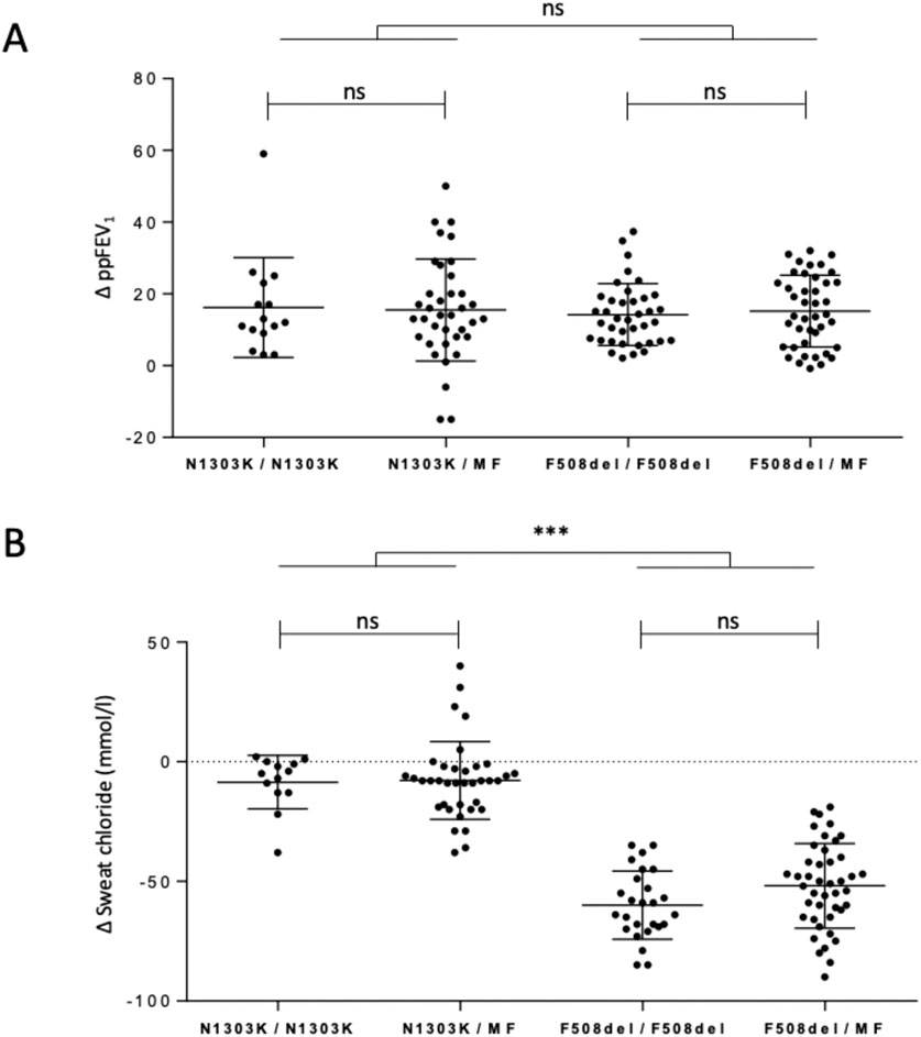 Figure 1. Change in percent predicted forced expiratory volume in 1 s and sweat chloride concentration in pwCF treated with Elexacaftor/Tezacaftor/Ivacaftor (ETI) carrying the N1303K or the F508del variant. Scatter dot plots indicate the corresponding variation after 2 months ETI in (A) percentage predicted Forced Expiratory Volume in 1 s (ΔppFEV 1) and (B) sweat chloride in mmol/l (Δsweat chloride). Comparison by unpaired t-test. ***: p < 0.001.