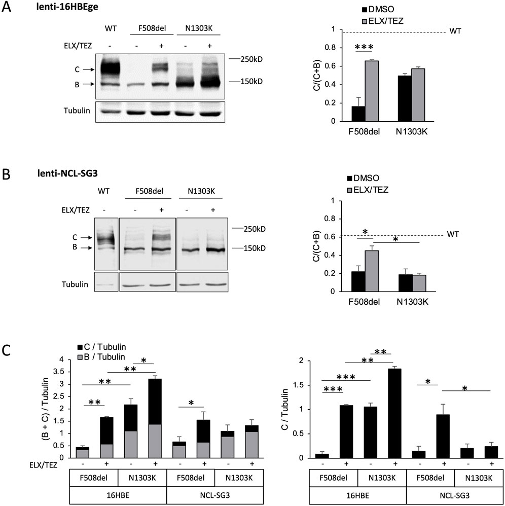 Figure 2. Expression of CFTR in respiratory and sweat gland cell lines stably expressing WT, F508del and N1303K-CFTR. Representative Western blot images and corresponding quantifications for WT, F508del and N1303K-CFTR in lenti-16HBEge-cells stably expressing CFTR after lentiviral transduction (A) sweat gland lenti-NCL-SG3 stably expressing CFTR after lentiviral transduction (B). Cells were treated for 48 h with vehicle (DMSO) or ELX/TEZ combination (3 µM/10 µM). Protein detection in (B) was performed on a single membrane but image was fragmented and reorganized for sample order as in (A). Detection of CFTR variants was performed on separate membranes and imaged separately. Bar graphs on the right panels correspond to the quantification of CFTR maturation expressed as a C/(C + (B) band ratio for each different cell type. As a reference, the dotted bar on the graph corresponds to the ratio for WT. (C) Comparison of total expression (left) and C band expression (right) of F508del and N1303K-CFTR at baseline and in TEZ/ELX corrected cells in lenti-16HBEge and lenti-NCL-SG3 cells. Data are presented as mean ± standard error (SEM) from a minimum of three independent experiments. *: p < 0.05; **: p < 0.01; ***: p < 0.001.