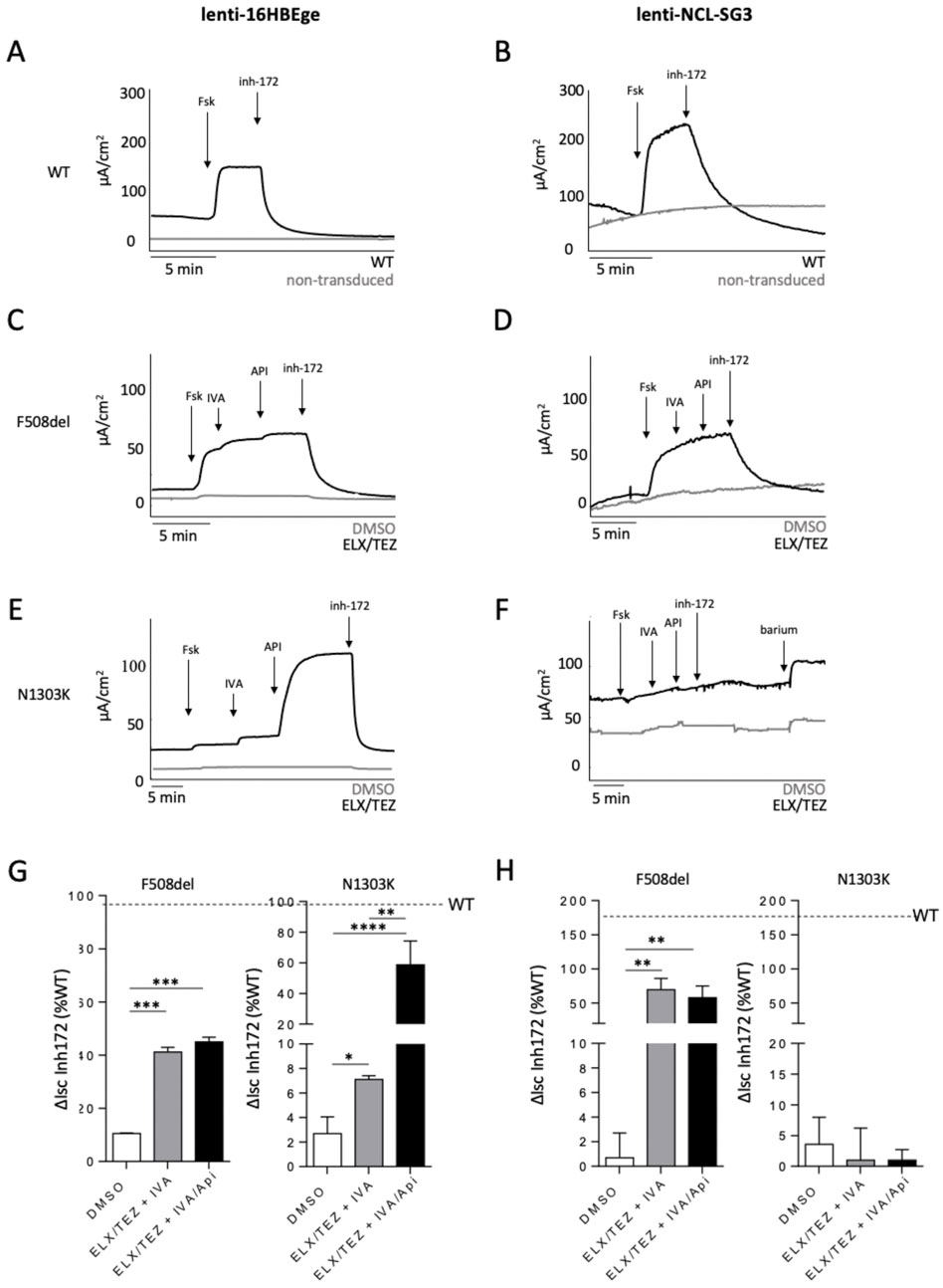 Figure 3. CFTR activity in respiratory and sweat gland cell lines stably expressing WT, F508del and N1303K-CFTR. CFTR activity quantified with short-circuit current technique in respiratory cell lines (lenti-16HBEge) (A,C,E,G) and sweat gland cell lines (lenti-NCL-SG3) (B,D,F,H) stably expressing WT (A,B), F508del (C,D) and N1303K (E,F) after lentiviral transduction, as compared to non-transduced cells (A, B, in grey) or non-corrected epithelia (C,D,E,F, in grey). Cells were treated for 48 h with vehicle (DMSO) or ELX/TEZ combination. During the recordings, the epithelia were sequentially treated with Forskolin (Fsk) (10 µM), to activate CFTR, IVA (1 µM), to potentiate CFTR, API (25 µM), to co-potentiate IVA, CFTR inhibitor-172 (10 µM) to inhibit CFTR, all added on the apical side. Barium (5 mM) was added in lenti-NCL-SG3-N1303K on the basal side, as a quality control. Representative tracings are shown. Summary of the results in G (lenti-16HBEge) and H (lenti-NCL-SG3) from a minimum of three independent experiments. Comparison by Wilcoxon test, *: p < 0.05, **: p < 0.01; ***: p < 0.001; ****: p < 0.0001.