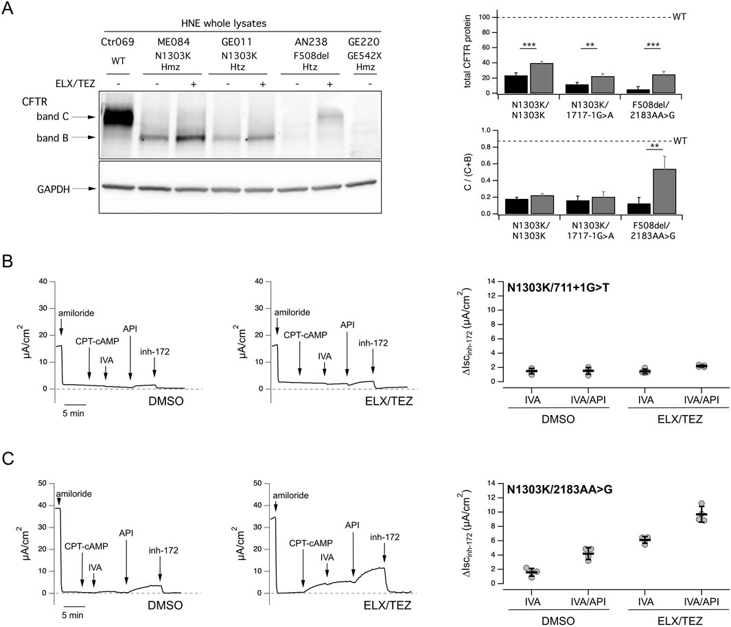Figure 4. Representative biochemical and functional analysis of N1303K-CFTR in Human Epithelial Nasal Epithelial cells. (A) Representative Western blot images and corresponding quantifications for WT, F508del and N1303K-CFTR in Human Nasal Epithelial primary cells (HNECs). (B,C) Representative tracings on the left panel of the effect of vehicle (DMSO), or the elexacaftor/tezacaftor (ELX, 3 µM/TEZ, 10 µM) combination on HNECs with the short-circuit-current technique. During the recordings, the epithelia were sequentially treated (as indicated by downward arrows) with amiloride (10 μM; added on the apical side), CPT-cAMP (100 μM; added on both apical and basolateral sides), ivacaftor (IVA, 1 μM; apical side), apigenin (API, 25 μM; apical side), and the CFTR inhibitor-172 (inh-172; 20 μM; apical side). The dashed line indicates zero current level. Right panel: scatter dot plot showing the summary of results. Data reported are the amplitude of the current blocked by inh-172 (∆Iscinh-172). For each experimental condition the number of biological replicates were n = 4-6. Short-circuit current performed on: (B) N1303K/711 + 1G>T nasal epithelial cells (derived from donor ID: GE156) (C) N1303K/3659delC nasal epithelial cells (derived from donor ID: GE132).