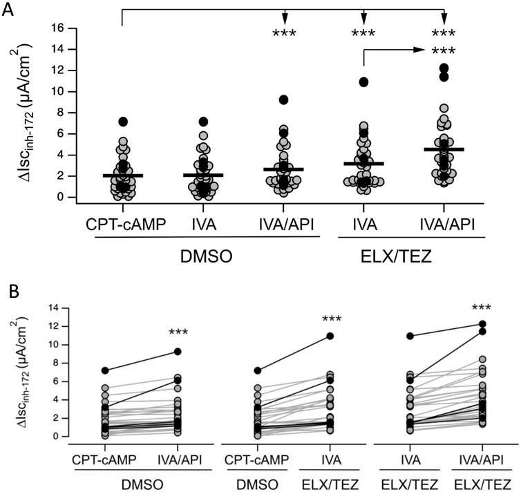 Although patients experienced beneficial clinical effect upon API, the range was not correlated to the increase in the CFTR activity observed in vitro. This may be explained by a potential ceiling effect for clinical improvement, and a potential cell intrinsic effect of API, not related to CFTR correction (DeRango-Adem and Blay, 2021). Moreover, the plasmatic level of API may not be sufficient to maximize the biological effect in the patient, stressing the need of optimized co-potentiator drugs (DeRango-Adem and Blay, 2021). Finally, we cannot exclude a CFTR-independent chloride transport induced by API, for ex a calcium dependent Cl− efflux already reported in the NCL cell line (Servetnyk and Roomans, 2007).