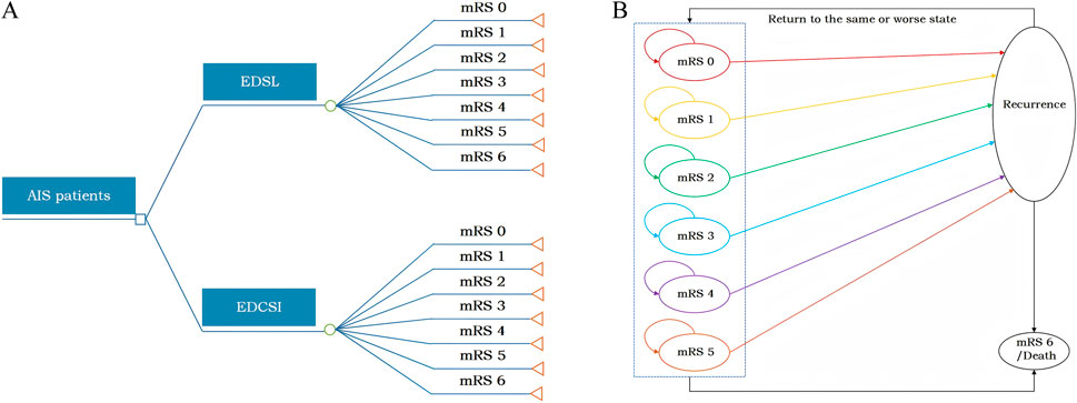 This study adhered to the Consolidated Health Economic Evaluation Reporting Standards (CHEERS 2022) reporting guidelines (Husereau et al., 2022) and was conducted in accordance with the China guidelines for pharmacoeconomic evaluations (2020) (Liu et al., 2020). Based on prior studies (Chen et al., 2024; Shi et al., 2022; Li et al., 2024) and available clinical trial data (Fu et al., 2024; Xu et al., 2021), a model combining a short-term decision tree (90 days) and a long-term Markov model (lifetime) was developed in Microsoft Excel to assess the lifetime costs and health benefits of EDSL versus EDCSI in AIS patients (Figure 1).