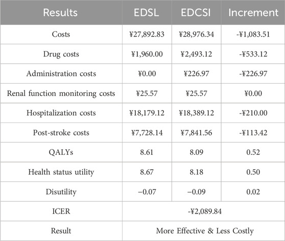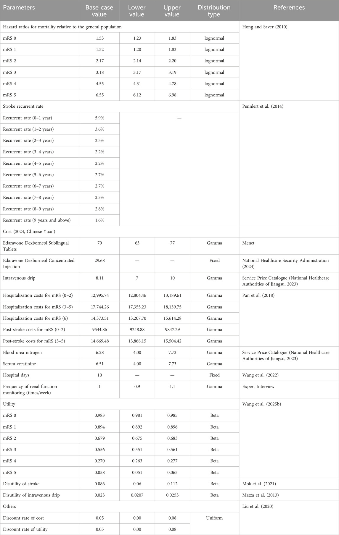 Drug prices were sourced from Menet and the 2024 National Insurance Catalogue (National Healthcare Security Administration, 2024). Additional intravenous drip costs for EDCSI were averaged across five provinces (Jiangsu, Beijing, Hubei, Sichuan, Guangdong) (National Healthcare Authorities of Jiangsu, 2023). Other medical costs included renal function monitoring (weekly blood urea nitrogen and serum creatinine), hospitalization (10-day average stay (Wang et al., 2022)), and post-stroke care, with unit costs based on provincial averages, and the frequency of monitoring was determined through expert interviews. One-time hospitalization and post-stroke costs were derived from the China National Stroke Registry (CNSR) (Pan et al., 2018) and adjusted to 2024 Chinese Yuan (¥) using the medical care component of China’s Consumer Price Index.