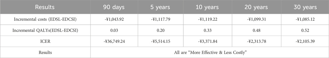 As shown in Table 3, EDSL maintained absolute advantages over EDCSI across all time horizons (90 days–30 years) under ATE-weighted analyses, reinforcing the robustness of the base-case results.