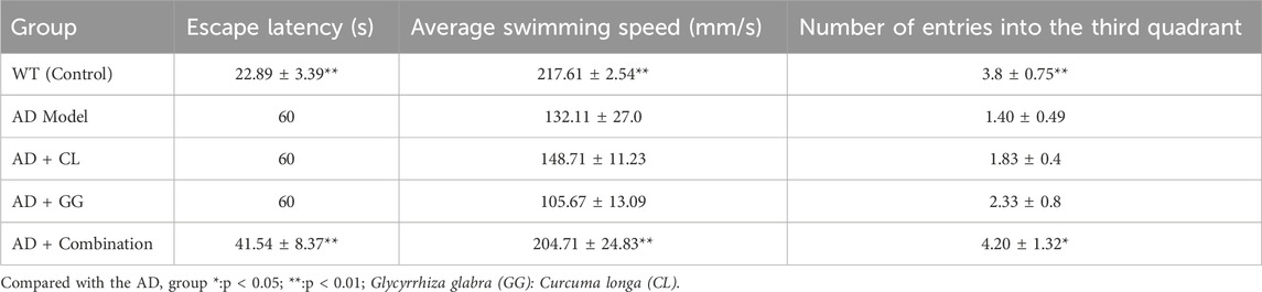 The Morris water maze was used to evaluate spatial learning and memory. Compared with wild-type (WT) mice, the AD model group displayed significantly prolonged escape latencies and reduced target quadrant entries (p < 0.01), indicating cognitive impairment. Curcumin (CL) treatment moderately improved escape latency (p < 0.05), whereas Glycyrrhiza glabra (GG) alone had minimal impact. Notably, the CL + GG combination produced the most pronounced improvements, with escape latency markedly shortened (p < 0.01) and target quadrant crossings significantly increased (p < 0.05) compared with the AD group.