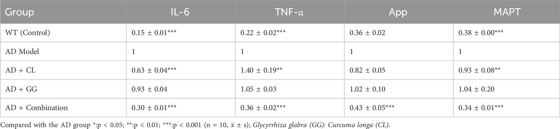 Curcumin monotherapy exerted a modest inhibitory effect on IL-6 expression (p < 0.05), while showing no significant impact on TNF-α, APP, or MAPT expression, indicating limited anti-inflammatory and anti-amyloid effects when used alone. Similarly, Glycyrrhiza glabra monotherapy failed to produce statistically significant changes across all measured biomarkers, suggesting that its standalone efficacy in modulating AD-related neuroinflammation and protein aggregation is minimal. In contrast, the combination treatment with curcumin and Glycyrrhiza glabra elicited the most robust therapeutic effects. Levels of both IL-6 and TNF-α were significantly reduced (p < 0.01and p < 0.05, respectively), indicative of enhanced anti-inflammatory activity. Moreover, the expression of APP and MAPT—key proteins implicated in Aβ deposition and tau hyperphosphorylation—was significantly downregulated (p < 0.05 and p < 0.01, respectively), suggesting that the co-treatment may alleviate AD-related pathological protein accumulation (Table 4).