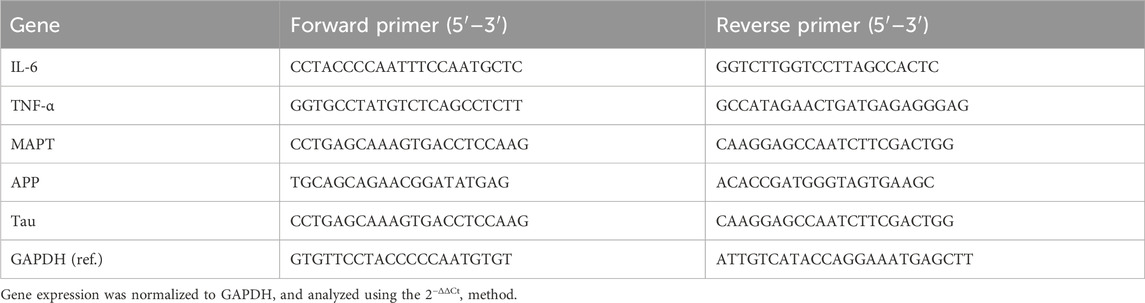 Total RNA was extracted from 100 mg of mouse brain tissue using RNAiso Plus (TAKARA). RNA purity and concentration were assessed spectrophotometrically. cDNA synthesis was performed using the PrimeScript™ RT reagent kit (TAKARA) with 600 ng total RNA input. qPCR was conducted using SYBR Green Master Mix (YEASEN) with the following gene-specific primers.