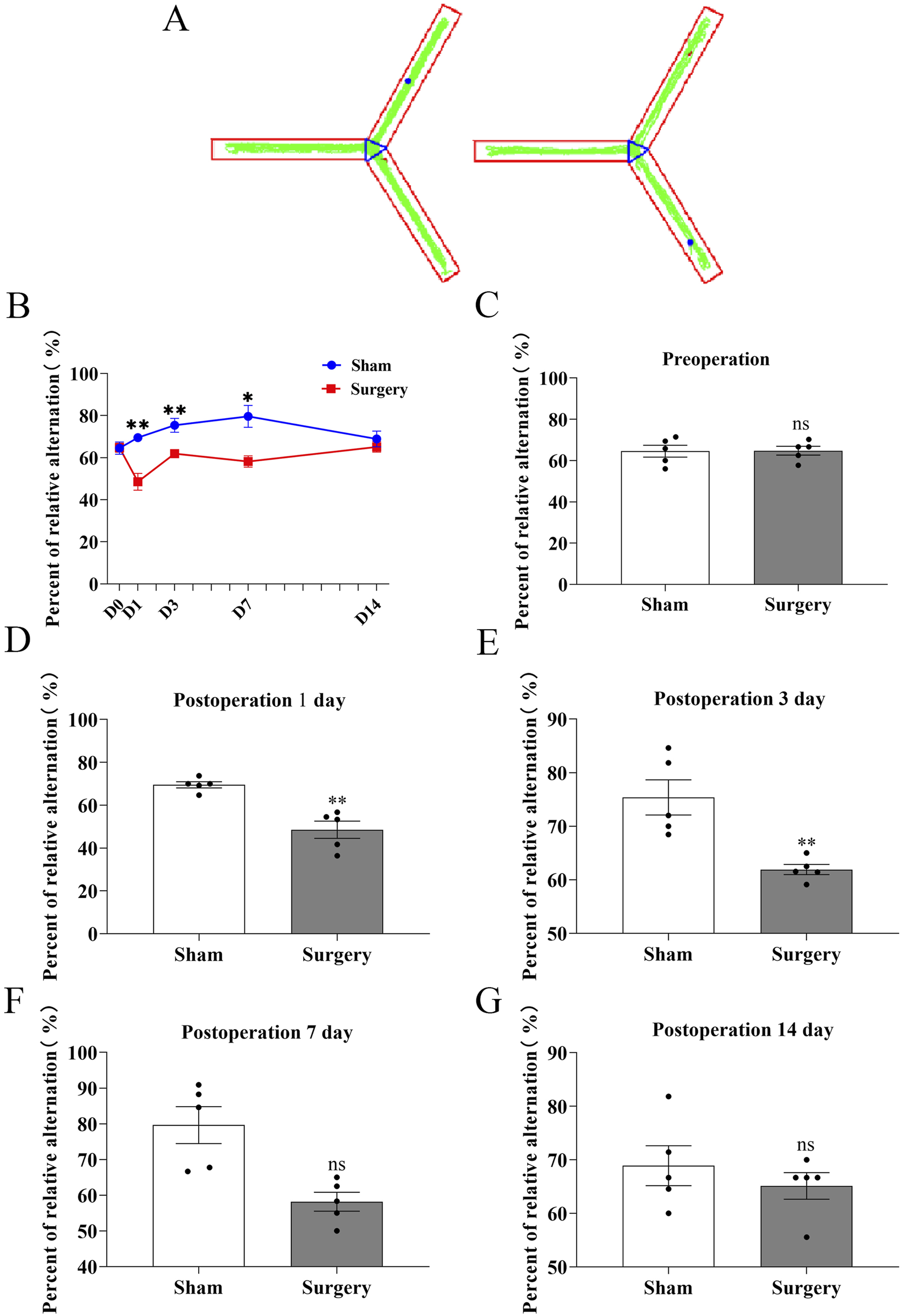 The percentage of correct voluntary alternations (%SA) was calculated as follows: %SA = number of correct arm entries/(total number of arm entries - 2) × 100%. Mice with fewer than 15 alternations during the test period are not counted in the final data. The mice were returned to their cages at the end of the test, and before proceeding to the next experiment, the mice were wiped with paper towels to remove any residual urine and faeces, and the arms were sprayed with 75% alcohol to remove the odour from the Y-maze.