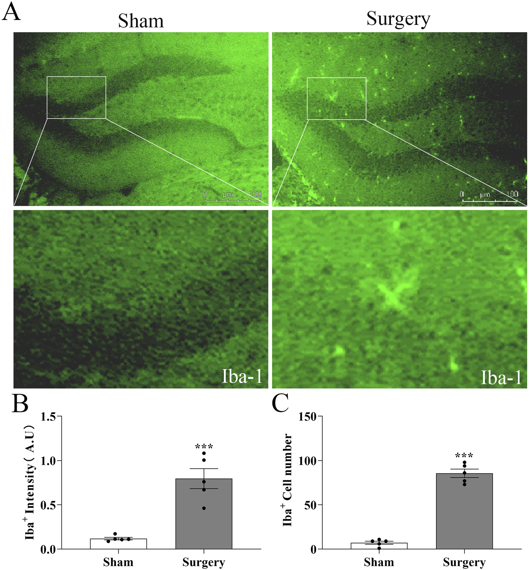 Mice were terminally anesthetized and transcardially perfused with ice-cold 0.9% saline followed by 4% paraformaldehyde (PFA). Brains were carefully removed and post-fixed in the same 4% PFA solution for 24 h at 4 C before being cryoprotected in paraffin embedding. Following dehydration through a graded ethanol series, tissues were cleared in xylene to remove alcohol and facilitate paraffin infiltration. Liquid paraffin was used to replace the hyaluronan in it and immersed into the tissue for support. Tissue blocks were embedded well by liquid paraffin and rapidly frozen until solidified into shape and then cut into 4 μm slices. The slices were floated in warm water at 45 C, picked up by clean slides, labelled with the group and date, and placed on a section holder in an oven at 65 C for 2 h. The slices were dewaxed and hydrated in xylene and ethanol at different concentrations, and permeabilized with 0.5% Triton X-100 in PBS to facilitate antibody penetration. Then they are sequentially closed, incubated with antibody (#Ab178847, anti- Iba-1, 1:8000, Abcam), and blocked. After the sections were dried, they were observed under a microscope (Leica DMi8) to obtain fluorescence images.