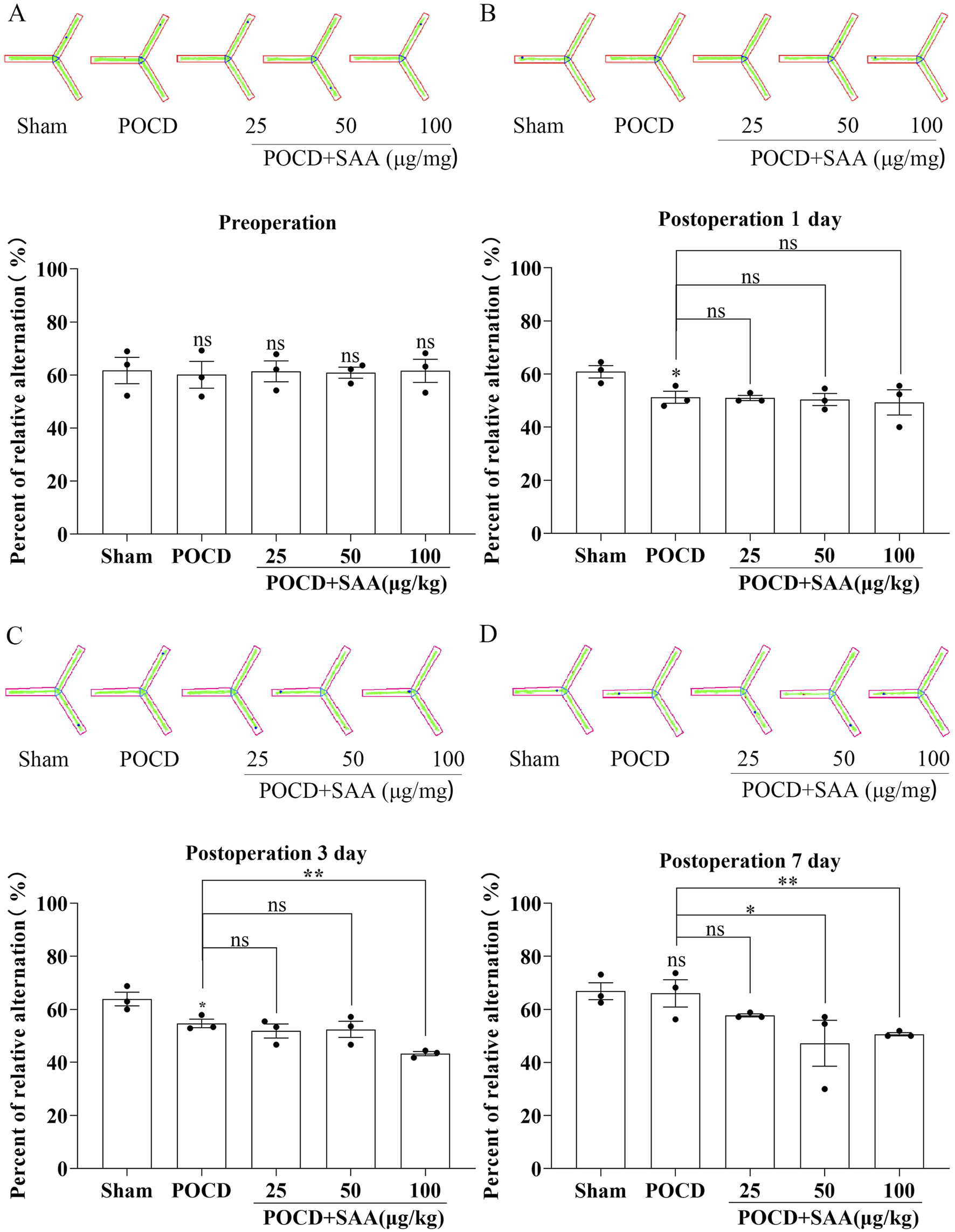 Recent years have seen SAA widely used in the diagnosis and prevention of infectious diseases, yet the relationship between SAA, neuroinflammation and POCD remains poorly understood. Here, we administered SAA to BV-2 cells and applied the culture medium to treat hippocampal neurons to assess its impact on neuronal apoptosis. Additionally, we treated POCD model mice with SAA, observed changes in various behavioral indices, and explored the underlying mechanisms.