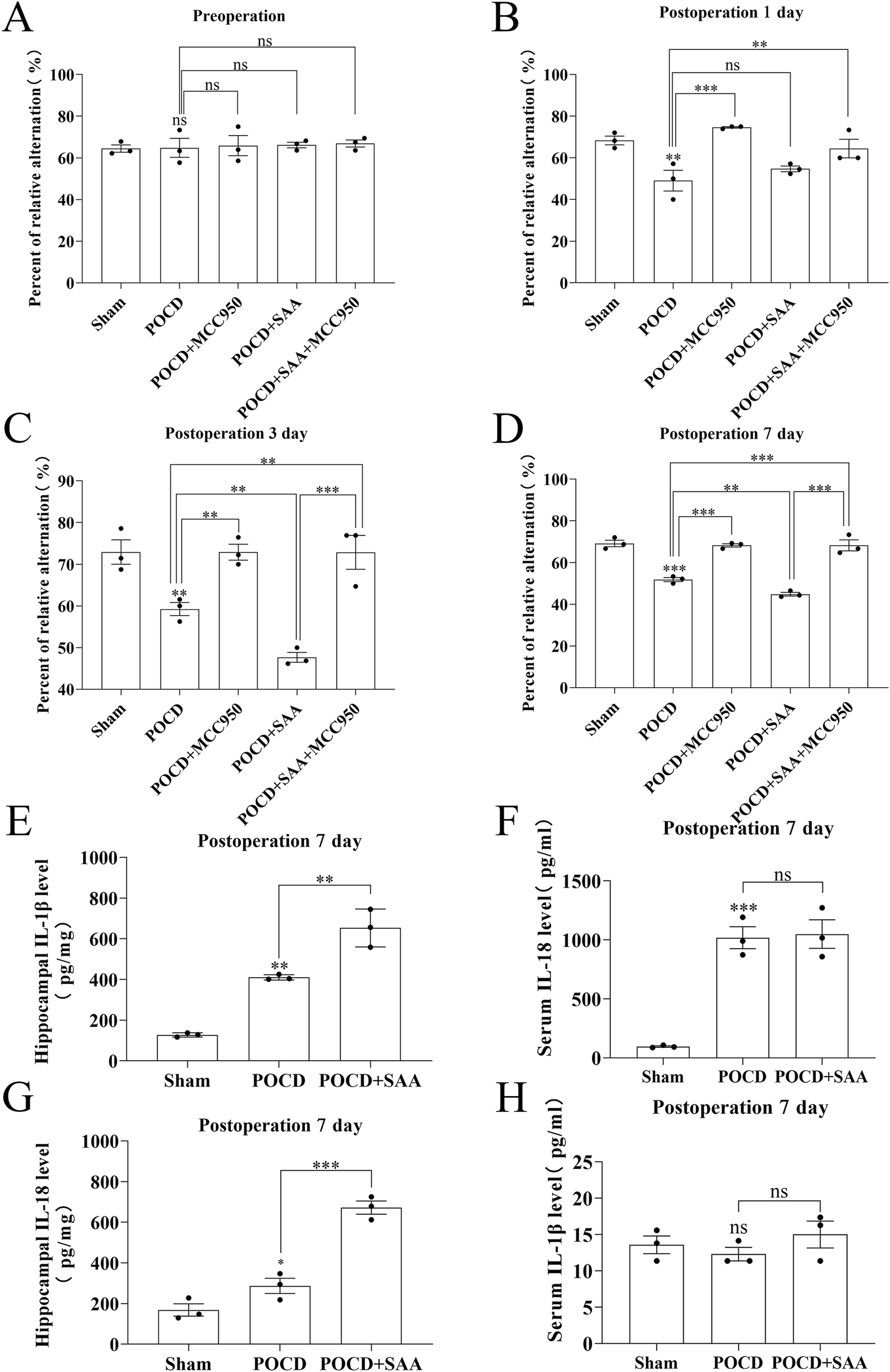 SAA was applied to BV-2 and HT22 cells to determine the optimal concentration and duration for stimulation. Inflammation-related and differentially expressed genes were identified through mRNA transcriptome sequencing (RNA-seq). Furthermore, apoptosis in hippocampal neurons was detected following treatment with the SAA-pretreated BV-2 cell culture medium. Furthermore, a postoperative cognitive dysfunction (POCD) mouse model was established using internal fixation of tibial fractures, followed by intraperitoneal injection of SAA and MCC950 (a selective NLRP3 inhibitor). Behavioral tests were then conducted to evaluate cognitive dysfunction in mice.