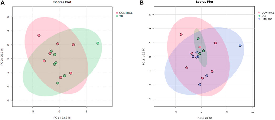 Figure 1. PCA score plots of serum samples collected on day 14. (A) Control group vs. Rifafour group, with considerable overlap between the two groups. (B) Inclusion of quality control samples (QCs) for quality assurance (QCs cluster together, indicating reliable analytical data).