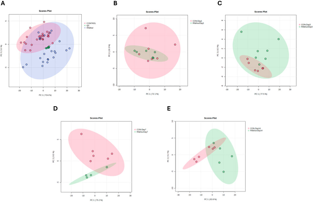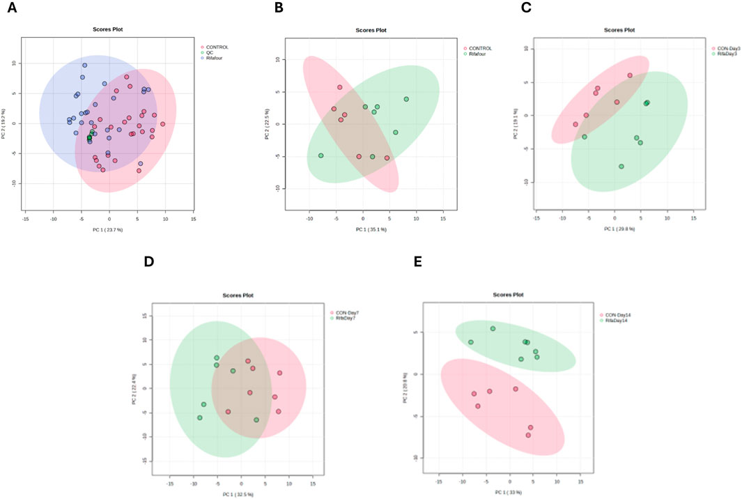 Figure 2B – day 1, illustrates the baseline metabolic profiles of all groups before Rifafour administration. The clustering on the PCA indicates a homogenous metabolic state, confirming the absence of treatment effects at this stage and providing a reference for subsequent comparisons. Figure 2C – day 3, shows a clear divergence between the control and Rifafour-treated groups, reflecting the early metabolic responses to the drug. These changes suggest initial systemic impacts of Rifafour on the host’s metabolism, potentially driven by acute biochemical adaptations. On day 7 (Figure 2D), the metabolic profiles of Rifafour-treated samples exhibit further divergence from those of the controls, indicating sustained metabolic alterations as the treatment progresses. By day 14 (Figure 2E), the separation between the treated and control groups becomes more pronounced, suggesting that Rifafour has overlapping effects on the metabolic pathways. These observations underscore the drugs’ ongoing impact on systemic metabolic dynamics.