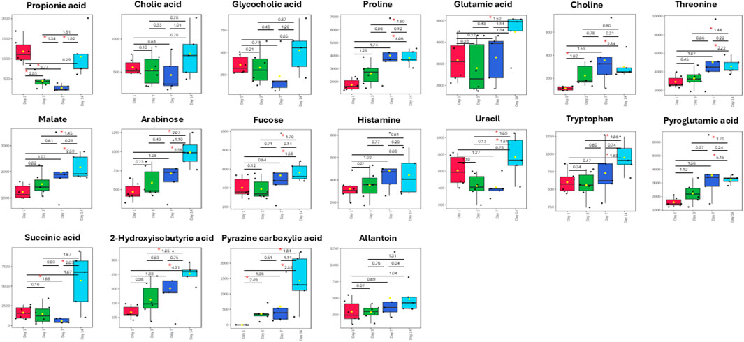 Figure 5. Box plots of important metabolites (VIP > 1.0) identified in fecal samples over 14 days of TB treatment. The only anti-TB medication metabolite that was detected in the feces was pyrazine carboxylic acid, which increased in concentration in the feces over the 14 days of treatment. Statistical significance (FDR p-value <0.05) is indicated by a red star * and Hedge’s g-value given per group time comparison (g > 0.8 is a large effect size). Time points (day 1, 3, 7, or 14) are given on the x-axis. Concentrations (y-axis) given as micromole per L or µM.