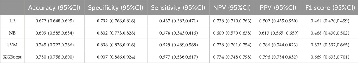 Using the eight key features selected through feature selection, four machine learning models were developed based on LR, NB, SVM, and XGBoost. To assess model performance and ensure internal validity, bootstrap resampling with 1,000 iterations was performed.