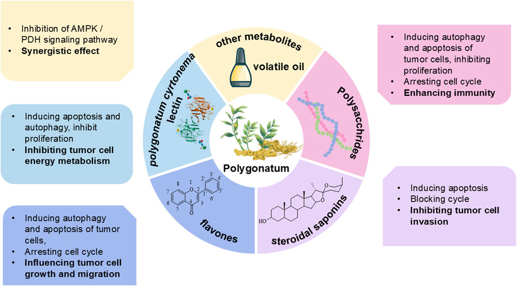 As a traditional Chinese botanical drug, Polygonatum spp. (Huangjing) is characterized by complex metabolites, with its principal active metabolites including polysaccharides, saponins, flavonoids, anthraquinones, alkaloids, amino acids, and volatile oils (Ren et al., 2020). Modern research indicates that the metabolites primarily responsible for its antitumor activity include polysaccharides, steroidal saponins, flavonoids, and Polygonatum cyrtonema lectin. The active antitumor metabolites of Polygonatum spp. and the different molecular mechanisms through which they exert their effects in cancer treatment are illustrated in Figure 1.