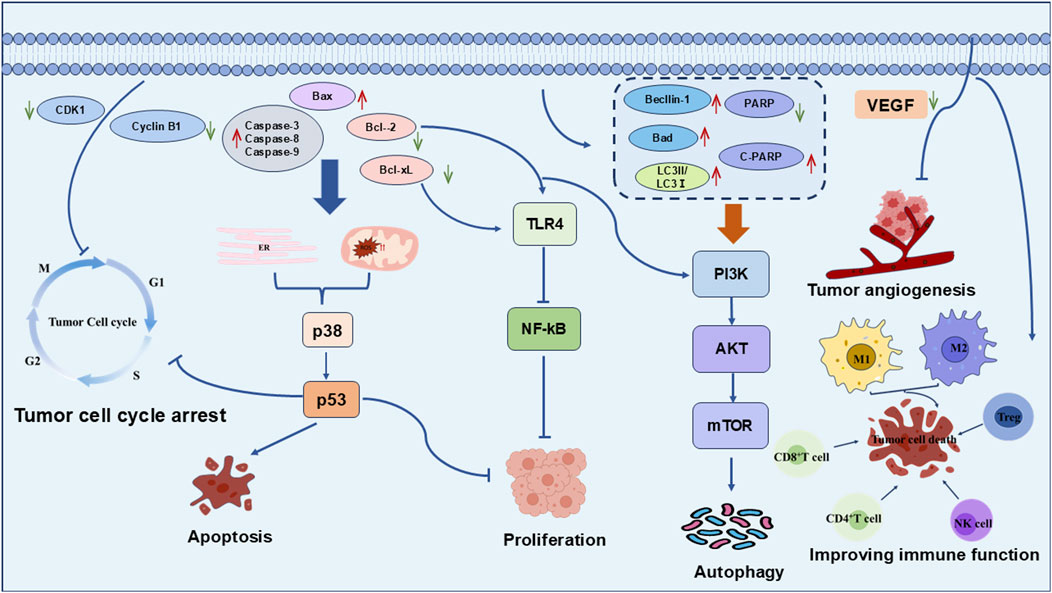Tumor cell proliferation refers to an abnormal and rapid process of cell division that bypasses normal growth regulatory mechanisms. It is characterized by autonomy, an accelerated cell cycle, evasion of growth inhibition, metabolic reprogramming, spatial heterogeneity, clonal evolution, and the ability to invade and metastasize, ultimately resulting in tumor formation and progression (Keibler et al., 2016). PSP has been explored for its effects on the human esophageal squamous cell carcinoma (ESCC) cell line Eca109 using in vitro assays at gradient concentrations of 50, 100, 200, and 400 μg/mL. This substantially attenuated the proliferative capacity of Eca109 cells by regulating TLR4 expression and inhibiting the NF-κB signaling pathway (Zhou et al., 2019b). Moreover, PCL significantly modulated the expression of apoptosis-related proteins, specifically increasing Bax levels while diminishing Bcl-xL and Bcl-2 expression. This alteration led to the excessive accumulation of ROS within the mitochondrial pathway, subsequently activating key signaling molecules such as p38 and p53. The resulting signaling cascade effectively suppressed the proliferation of human melanoma A375 cells, with an IC50 value of 15 μg/mL observed within 24 h (Liu et al., 2009a).