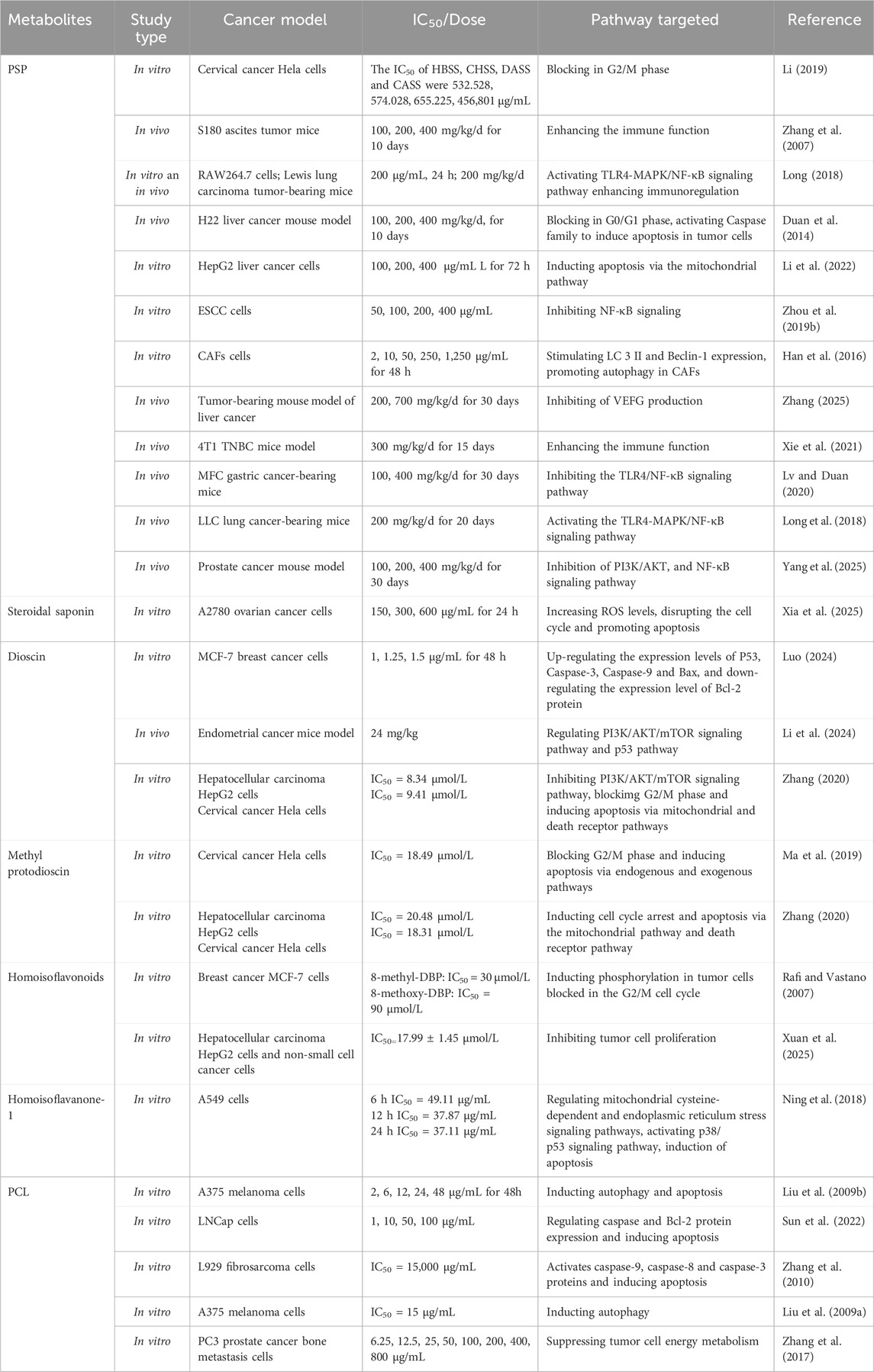 TCM has a long-standing history and extensive practical experience in cancer treatment, owing to its multi-metabolites, multi-target, and holistic regulatory properties (Chan, 1995). Polygonatum spp., a traditional medicinal and edible substance, has been used in China for over 2,000 years. As recorded in the Compendium of Materia Medica, it “nourishes the middle and benefits the qi, removes wind-dampness, pacifies the five viscera, lightens the body, and prolongs life when taken for a long time”. This botanical drug is characterized by its sweet taste and neutral nature, and it is attributed to the spleen, lung, and kidney meridians. It is renowned for its capacity to replenish qi, nourish yin, enhance spleen function, moisten the lungs, and support kidney health. Modern research has identified numerous chemical metabolites in Polygonatum spp., such as polysaccharides, steroidal saponins, flavonoids, and amino acids, which exhibit antioxidant, anti-inflammatory, antibacterial, hypoglycemic, hypolipidemic, and immunomodulatory effects (Zhao et al., 2018). Recent studies also suggest that Polygonatum spp. May inhibit tumor cell proliferation, induce apoptosis, and enhance immunity (Liu et al., 2024b). However, most investigations have focused on single metabolite, and its mechanisms remain insufficiently clarified. Therefore, this paper aims to summarize the main antitumor metabolites of Polygonatum spp. and their mechanisms of action, analyze current research progress, and identify existing challenges, thereby providing a foundation for its further development and application as a natural anticancer agent.