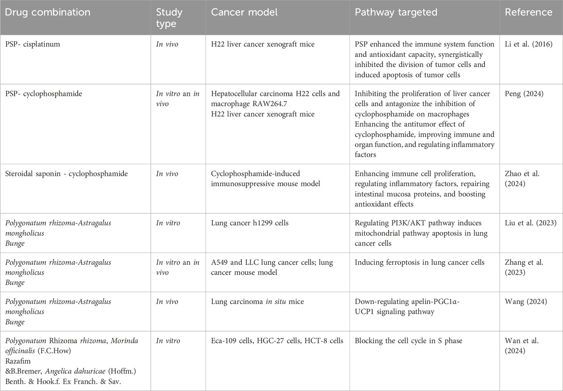 Multi-drug combination strategy is a crucial approach for improving cancer treatment, and it represents a mainstream modality in clinical oncology. TCM is characterized by its moderate efficacy, holistic treatment philosophy, and relatively low toxicity, which addresses the limitations of conventional therapies and is increasingly recognized as a valuable adjunct in tumor management. Recent studies have indicated that active metabolites of Polygonatum spp. can significantly enhance therapeutic outcomes when used in combination with conventional chemotherapeutic agents. For instance, co-administration of PSP with cyclophosphamide has been shown to reduce toxicity and reverse cisplatin resistance, whereas combination with Astragalus polysaccharides resulted in a synergistic enhancement of antitumor activity (Table 2).