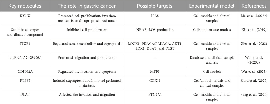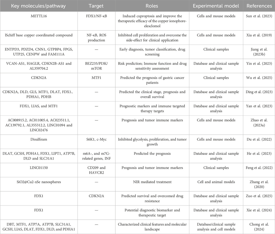 It should be acknowledged that current evidence regarding cuproptosis in gastric cancer predominantly originates from cell-based experiments, animal models, and retrospective bioinformatic analyses. While these studies provide crucial mechanistic insights and suggest therapeutic potential, they have not yet been substantiated by large-scale prospective clinical trials. Therefore, the implications discussed in this review should be interpreted as hypothesis-generating rather than as confirmed clinical evidence. Further translational research and rigorously designed clinical studies are needed to validate the role of cuproptosis in gastric cancer and its applicability to human patients.