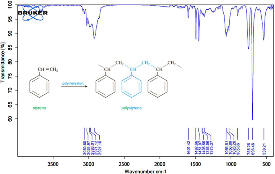 Figure 1. ATR-FTIR spectrum of synthesized polystyrene microplastics (PS-MPs). The spectrum confirms the characteristic functional groups of polystyrene.