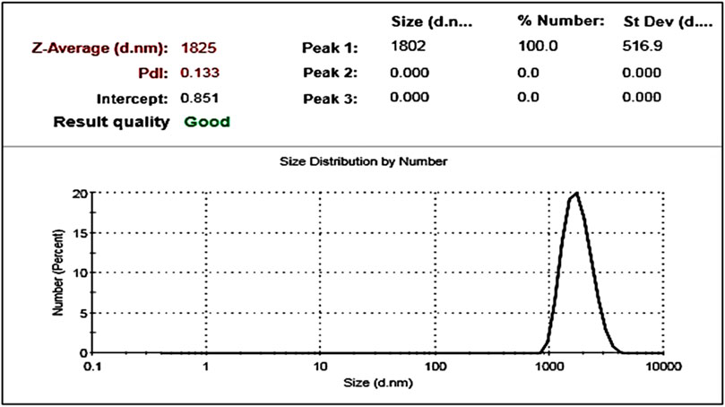 Dynamic Light Scattering (DLS) (Figure 3) analysis supported the Scanning Electron Microscopy findings, confirming an average particle size of 1.8 µm. The particles displayed a low polydispersity index (PDI = 0.133), indicating a uniform size distribution.