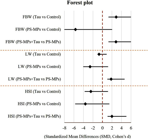 Figure 4. Forest plot of standardized mean differences (Hedges’ g) with 95% confidence intervals for the effects of taurine (Tau) and polystyrene microplastics (PS-MPs) on final body weight (FBW), liver weight (LW), and hepatosomatic index (HSI) on adult male Swiss mice after 60 days of oral dosing. A vertical dashed line at 0 indicates no effect relative to Control. Negative values indicate a reduction compared to Control, while positive values indicate an increase.