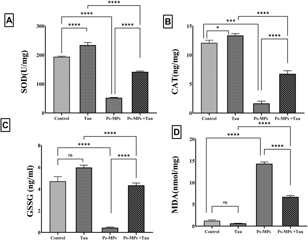 Figure 5. Effect of polystyrene microplastics (PS-MPs) and/or Taurine (Tau) exposure on hepatic tissue levels of Superoxide dismutase (SOD) (A), Catalase (CAT) (B), Glutathione disulfide (GSSG) (C), and Malondialdehyde (MDA) (D) in a mouse model. Data expressed as mean ± SE, n = 10 for each group. *P<0.05, ***P < 0.0001, and “ns” means “non-significant”.