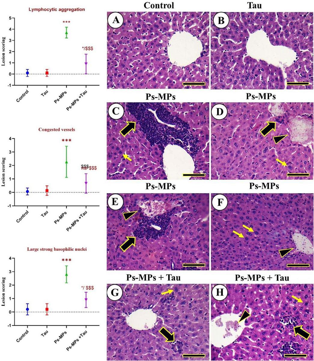 Figure 7. Histopathological examination of the liver of mice. (A) Negative control. (B) Tau. (C–F) Ps-MPs group revealing congested central and portal veins, massive aggregations of lymphocytic cells, and the hepatocytes appeared markedly swollen, with a disorganized arrangement, and exhibited strong, large nuclei with strong basophilic staining. (G,H) Ps-MPs + Tau group. Congested veins (arrowheads), aggregated lymphocytic aggregations (thick black arrows), and large nuclei with strong basophilic staining (thin yellow arrows). Scale bar =50 mm. Moreover, the figure explains the lesion scoring in the hepatic tissue of mice in all experimental groups in the form of a histogram, which indicates the different lesion scoring, including Lymphocytic aggregation, Congested vessels, and large, strong basophilic nuclei.