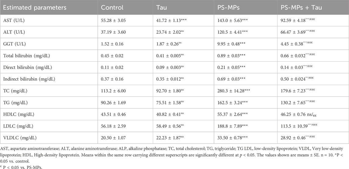 Exposure to PS-MPs significantly disrupted liver function and lipid metabolism in adult male Swiss mice after 60 days of oral administration. Compared to the control group (Table 1), PS-MPs significantly (P < 0.001) elevated serum levels of AST, ALT, and GGT by approximately 159%, 224%, and more than 6.5-fold, respectively, indicating severe hepatocellular injury. Co-administration of Tau notably mitigated these elevations, reducing AST by 35%, ALT by 45%, and GGT by 55% compared to the PS-MPs group (P < 0.001), suggesting a potent hepatoprotective effect. Interestingly, Tau alone resulted in a significant (P < 0.001) 24% decrease in AST activity relative to control, reflecting its baseline liver-protective potential.