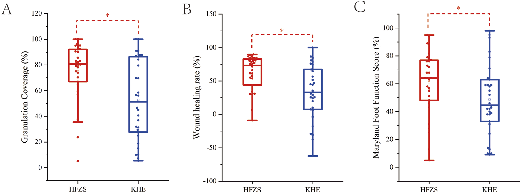 Comparison of therapeutic efficacy between two groups. (A) The granulation tissue coverage rates after treatment. (B) The wound healing rates after treatment. (C) Maryland foot function score after treatment. HFZS: Huafu Zaisheng method. KHE: Comfeel® Plus wound dressing. “*” indicates P < 0.05.