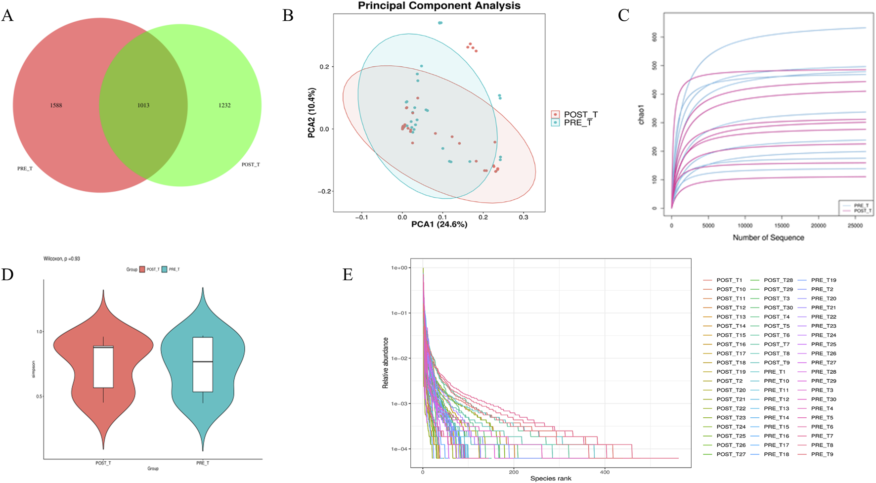 Diversity and composition analysis of wound microbiota before and after Treatment. (A) ASV Distribution Venn Diagram. (B) PCA plot illustrating beta diversity differences. (C) Rarefaction curves of Simpson index showing sequencing depth adequacy. (D) Representative Chao1 index for alpha diversity. (E) Rank Abundance curve depicting species richness and dominance.