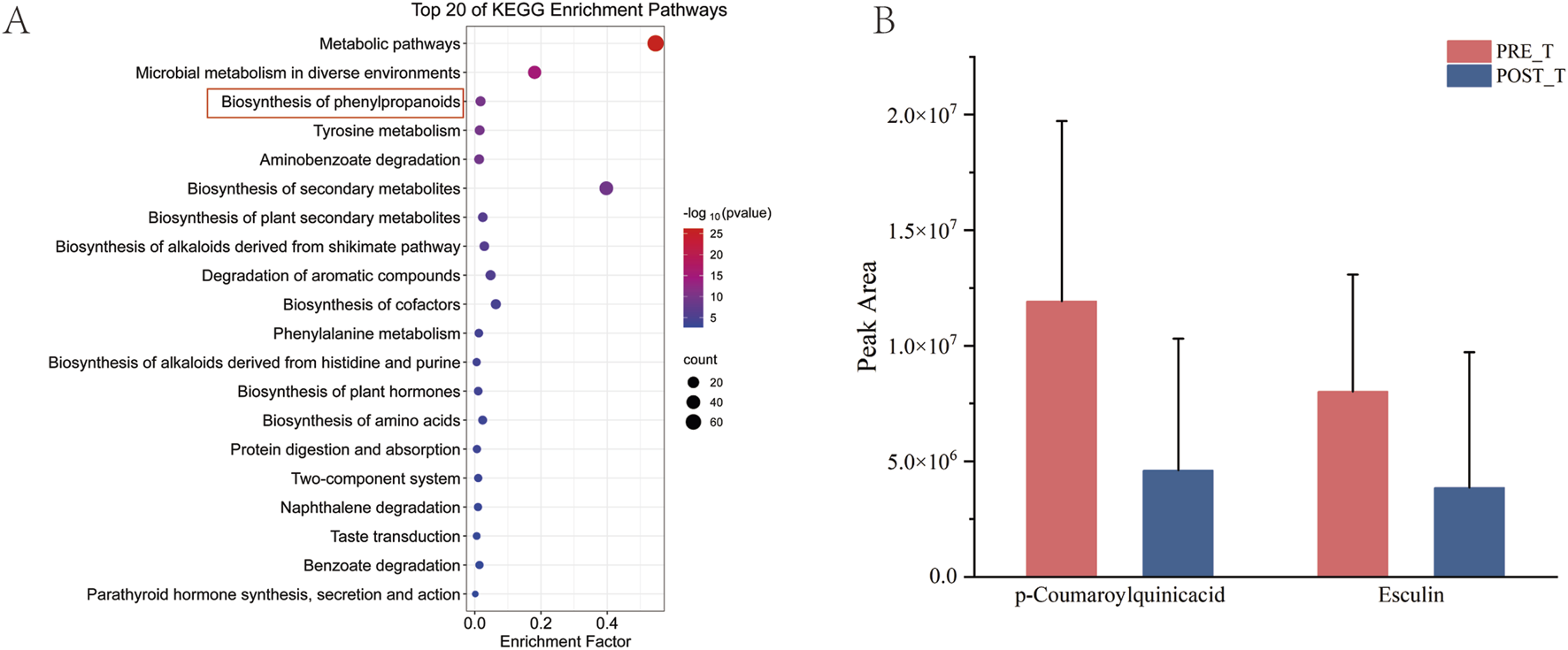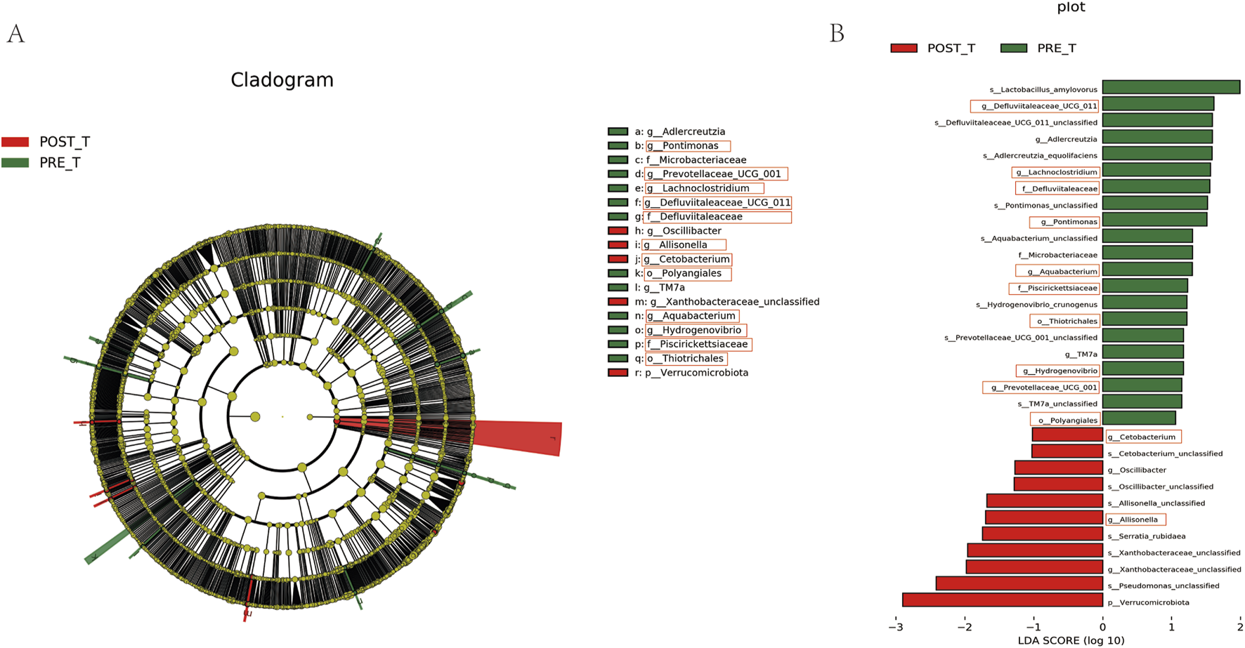 Differential species analysis and LDA effect size visualization. (A) Differential species annotation cladogram. (B) Histogram of LDA Effect Size.