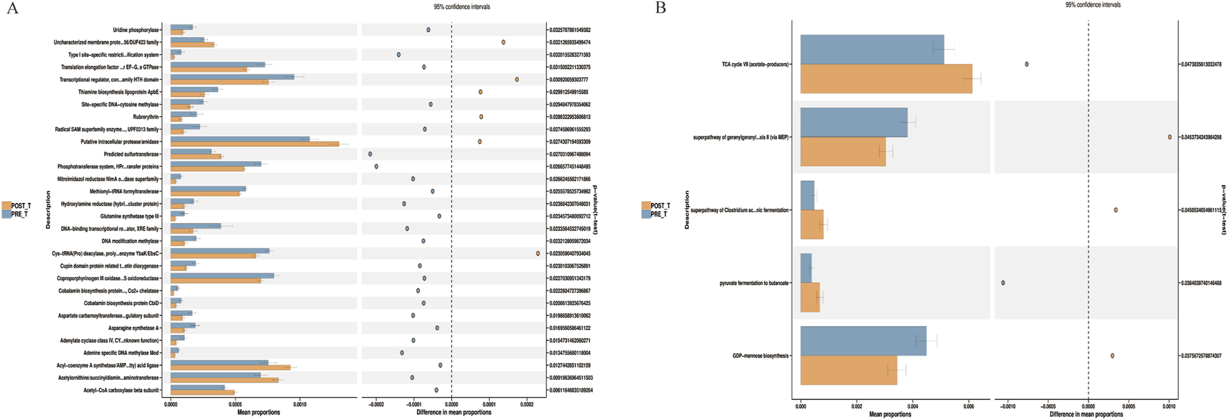 Differential microbial function analysis based on COG (A) and pathway (B).