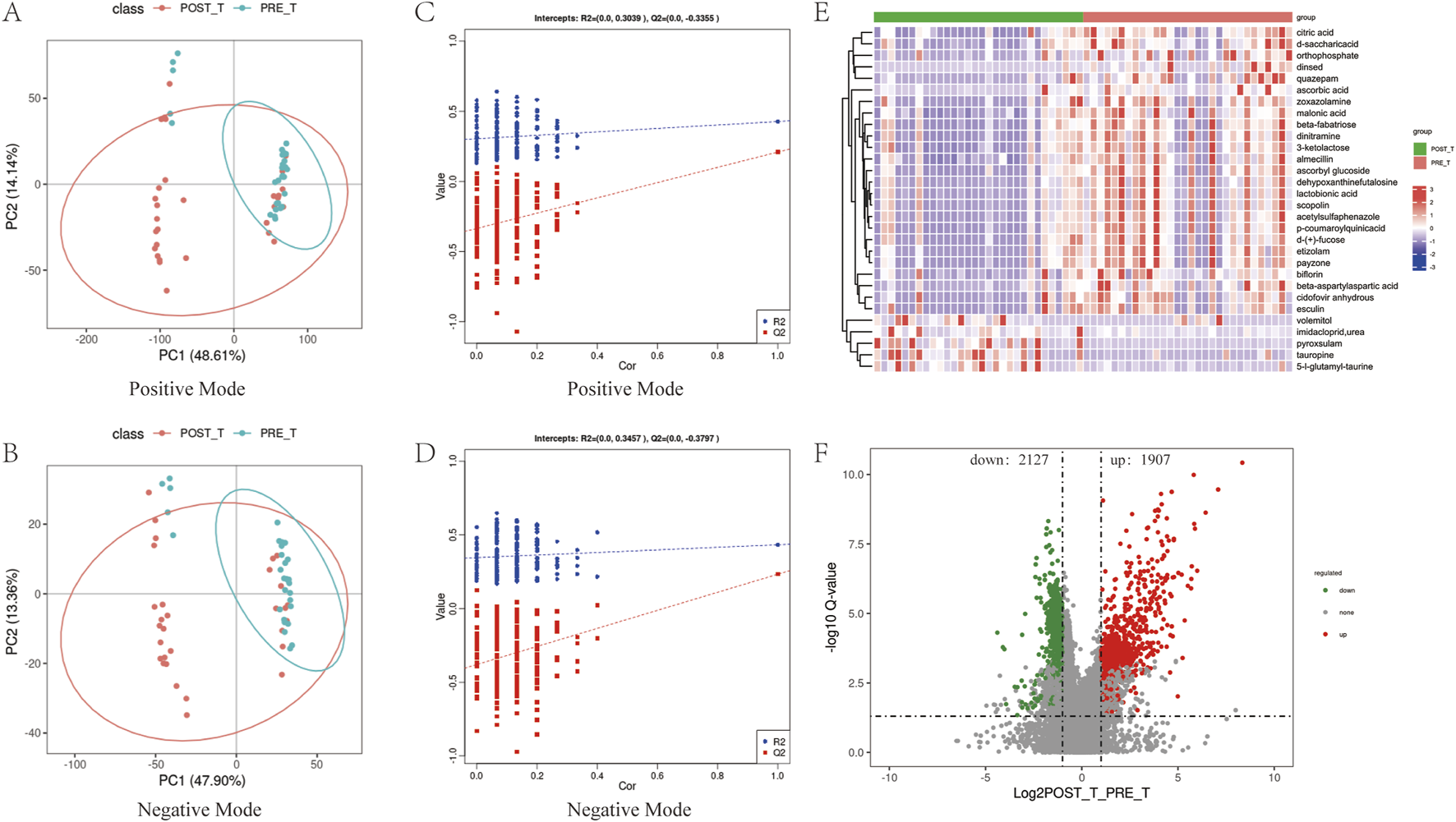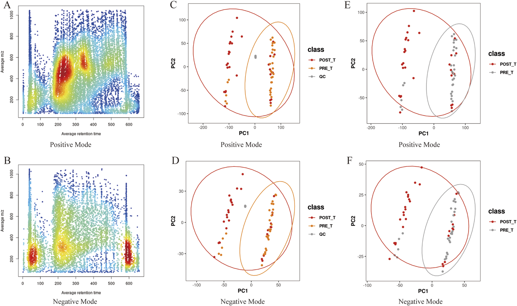 Data quality analysis. (A,B) The m/z-rt distribution plot of positive/negative ion metabolites, with rt on the x-axis and m/z on the y-axis. (C,D) PCA plots of positive/negative ions including quality control (QC) samples. (E,F) PCA plots of positive/negative ions for pre- and post-treatment groups.