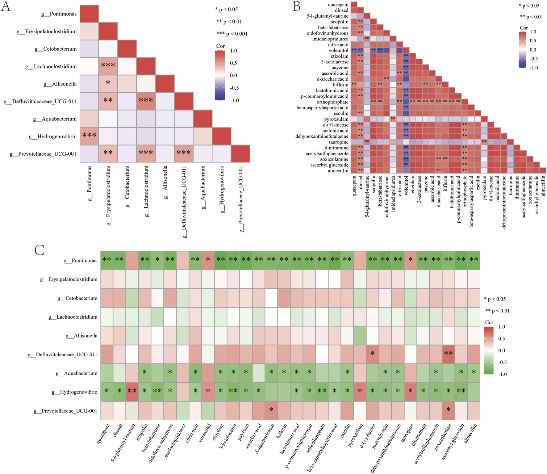 Differential analysis was performed for species at each taxonomic level, and significant differential species (P < 0.05) were identified. At the mesophyll level, Thiotrichales and Polyangiales showed a significant decrease after treatment compared to before treatment (Figure 4A). At the family level, Defluviitaleaceae and Piscirickettsiaceae exhibited a significant decrease after treatment compared to before treatment (Figure 4B). At the genus level, after excluding unclassified genera, a significant decrease was observed in Erysipelatoclostridium, Lachnoclostridium, Defluviitaleaceae_UCG-011, Pontimonas, Aquabacterium, Hydrogenovibrio, and Prevotellaceae_UCG-001 after treatment compared to before treatment, while Cetobacterium and Allisonella significantly increased after treatment (Figure 4C). At the species level, after removing unclassified taxa, a significant decrease was observed in Hydrogenovibrio crunogenus and Lactobacillus amylovorus after treatment, while Serratia rubidaea showed an increase (Figure 4D).