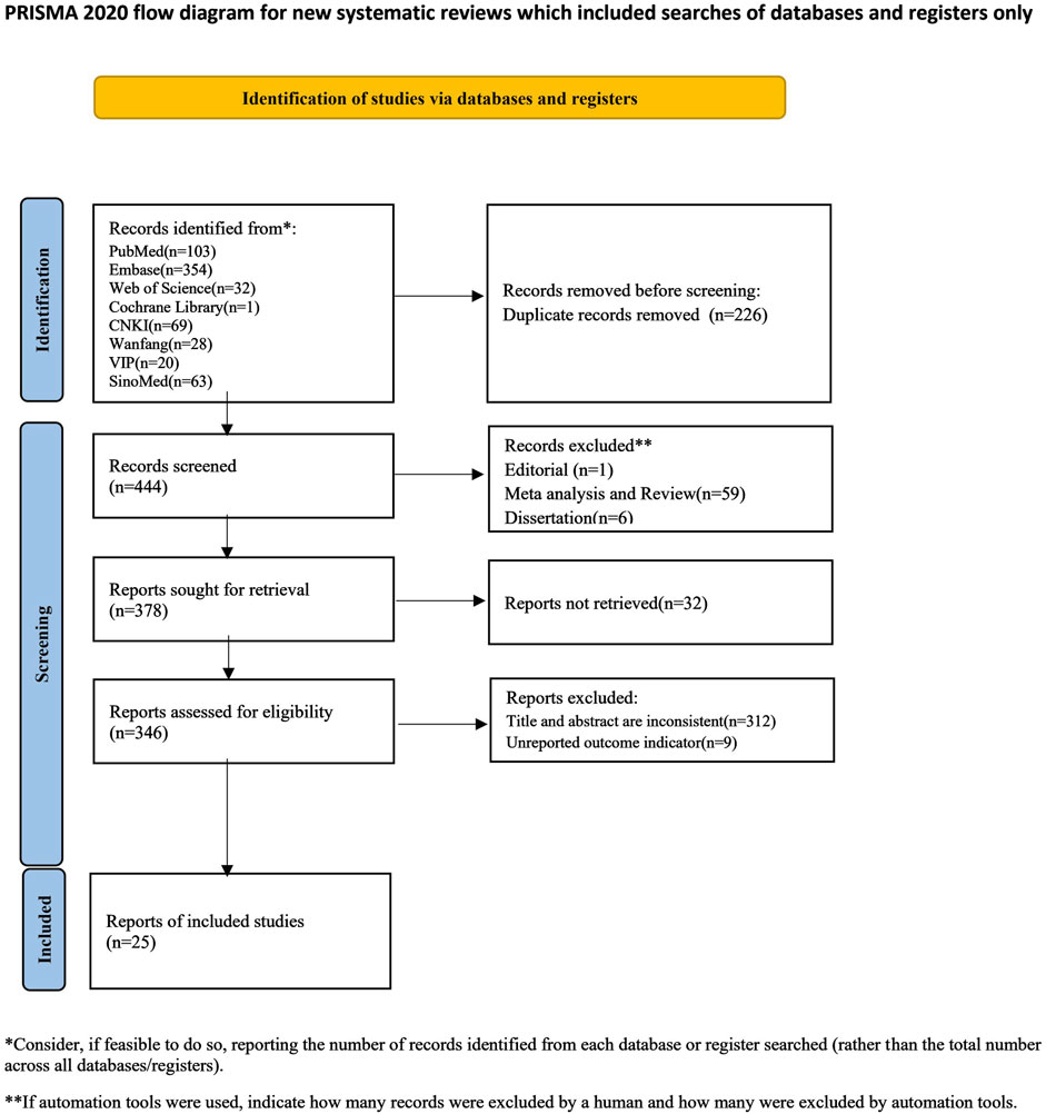 An initial search using the retrieval strategy yielded 670 articles, including 103 from PubMed, 354 from Embase, 32 from Web of Science, 1 from the Cochrane Library, 69 from CNKI, 28 from Wanfang, 20 from VIP, and 63 from SinoMed. After excluding 226 duplicate articles, 444 were retained. After excluding editorials, reviews, and theses, 378 articles remained. 32 articles were unavailable for full-text retrieval, 9 did not report outcome measures, and 312 were found to be inconsistent with the outcome measures after reviewing the titles, abstracts, and full texts. Ultimately, 25 articles were included, comprising 25 studies and 90 groups. Eleven studies included multiple dose groups, with six studies having three dose groups (Wang et al., 2011b; a; Zhang et al., 2011; He et al., 2012; Wang et al., 2021; Wang L. et al., 2022), and five studies having two dose groups. Eleven studies included multiple experimental time groups, with two studies including four experimental time groups (Zhang et al., 2011; Liu et al., 2013), seven studies including three experimental time groups (Cao and Mao, 2008; Wang et al., 2011b; a; He et al., 2012; Li et al., 2012; Li et al., 2015; Jin et al., 2016; Wang et al., 2021; Wang L. et al., 2022), and two studies including two experimental time groups (Jin et al., 2016; Wang L. et al., 2022). A flow chart of literature selection is shown in Figure 2.
