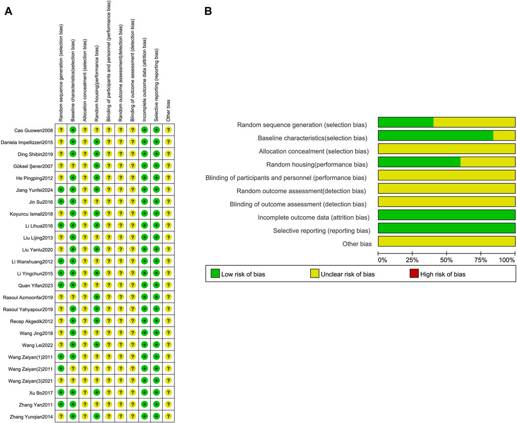 Two researchers independently assessed the quality of the literature using the SYRCLE animal experiment bias risk assessment tool (Hooijmans et al., 2014) in Review Manager 5.4 software, evaluating 10 items, Selection bias: Sequence generation, Baseline characteristics, and Allocation concealment, Performance bias: Random housing, and Blinding, Detection bias: Random outcome assessment, and Blinding, Attrition bias: Incomplete outcome data, Reporting bias: Selective outcome reporting, and other sources of bias. Each item was assessed as low risk (low risk, method applied correctly), unclear risk (unclear risk, method application unclear) or high risk (high risk, method applied incorrectly or not used). This process was conducted independently by two researchers and cross-checked. In case of disagreement, the two researchers discussed and decided; if no consensus was reached, a third researcher assisted in making the decision.