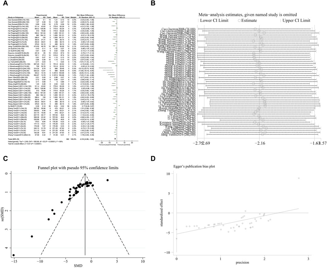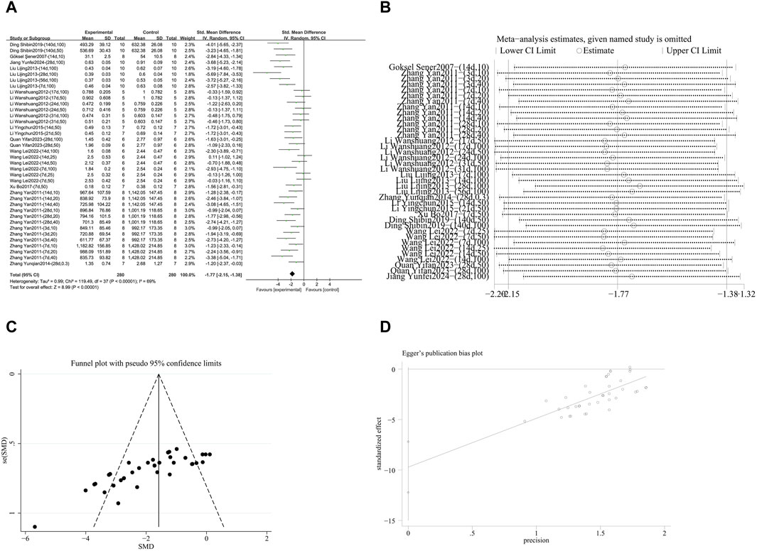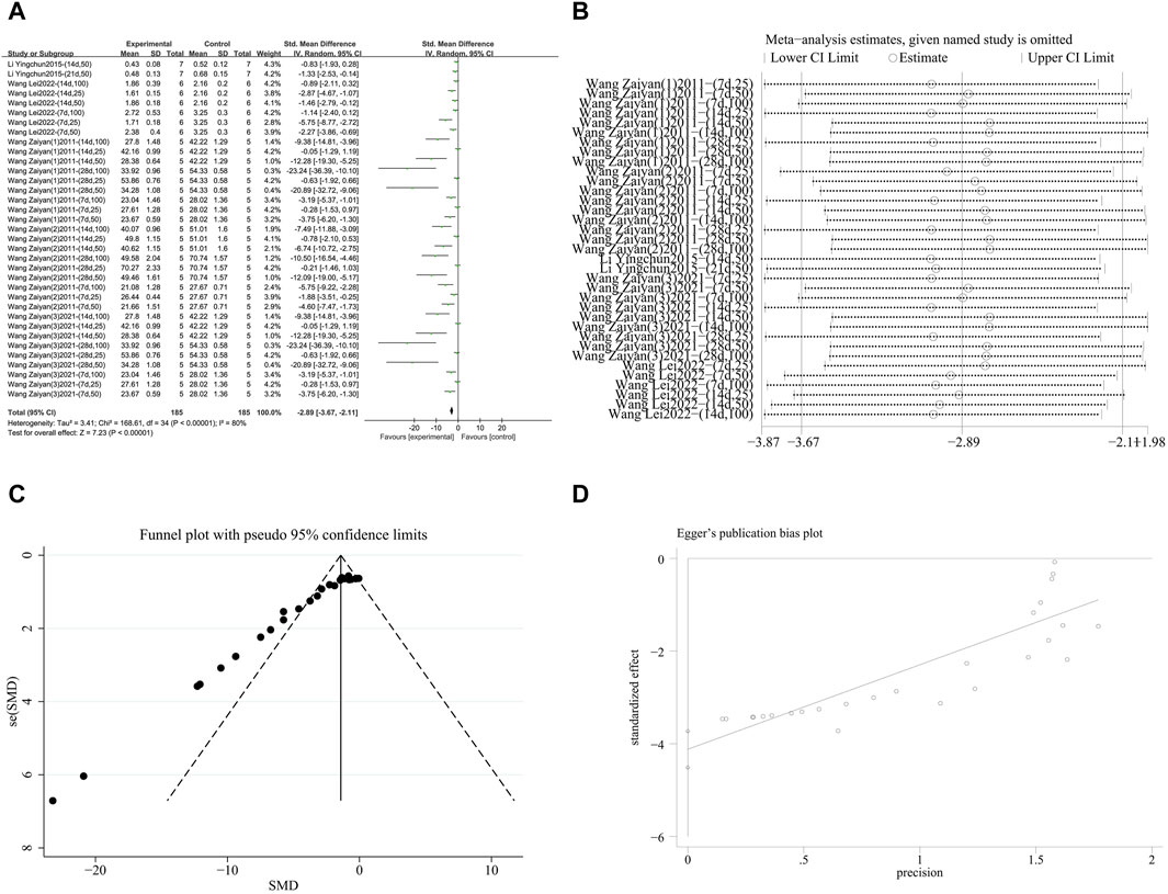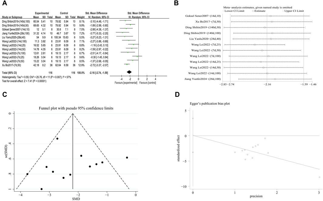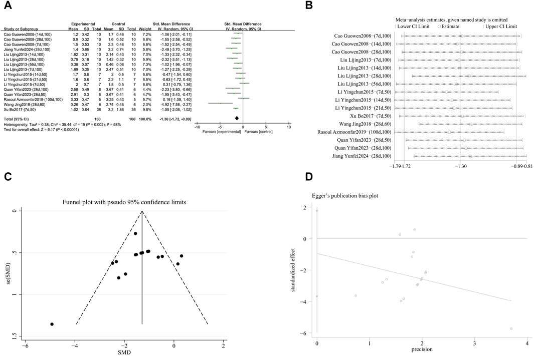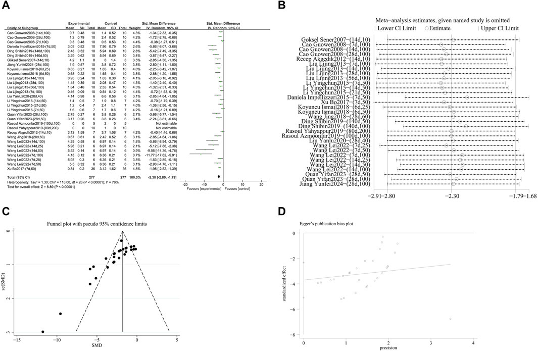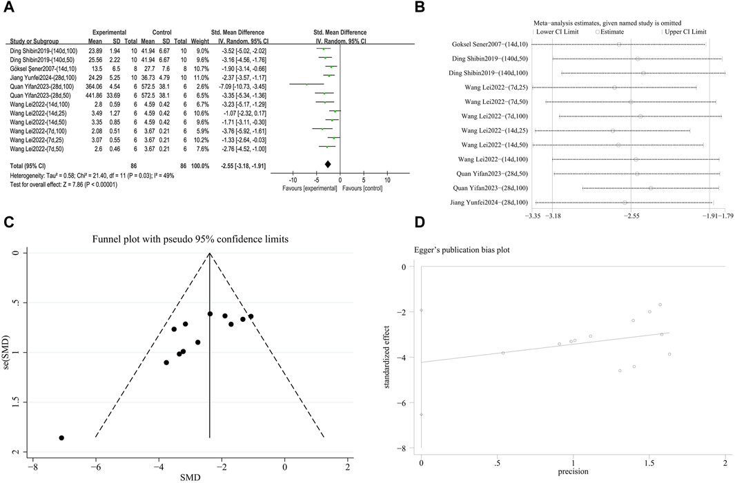 A meta-analysis was conducted on the effect sizes of MDA content in 11 studies from 8 literature sources, the study samples were obtained from bronchoalveolar lavage fluid, lung tissue or serum. Compared with the control group, RES significantly reduced MDA content. There was significant heterogeneity among the included studies, and a random-effects model was used (SMD = −2.20, 95% CI [−2.87, −1.53], p < 0.0001, I2 = 57%) (Supplementary Figure S10A). Sensitivity analysis indicated that the results were stable (Supplementary Figure S10B). Further subgroup analysis showed no significant differences in animal species (p = 0.28), animal strain (p = 0.31), RES drug source (p = 0.38), RES dosage (p = 0.35), RES intervention duration (p = 0.80), pulmonary fibrosis modeling method (p = 0.10), and RES administration route (p = 0.57) were not sources of heterogeneity, so the cause of this study remains unclear. Additionally, funnel plots (Supplementary Figure S10C) and Egger’s test (p < 0.0001) (Supplementary Figure S10D) indicated the presence of publication bias.