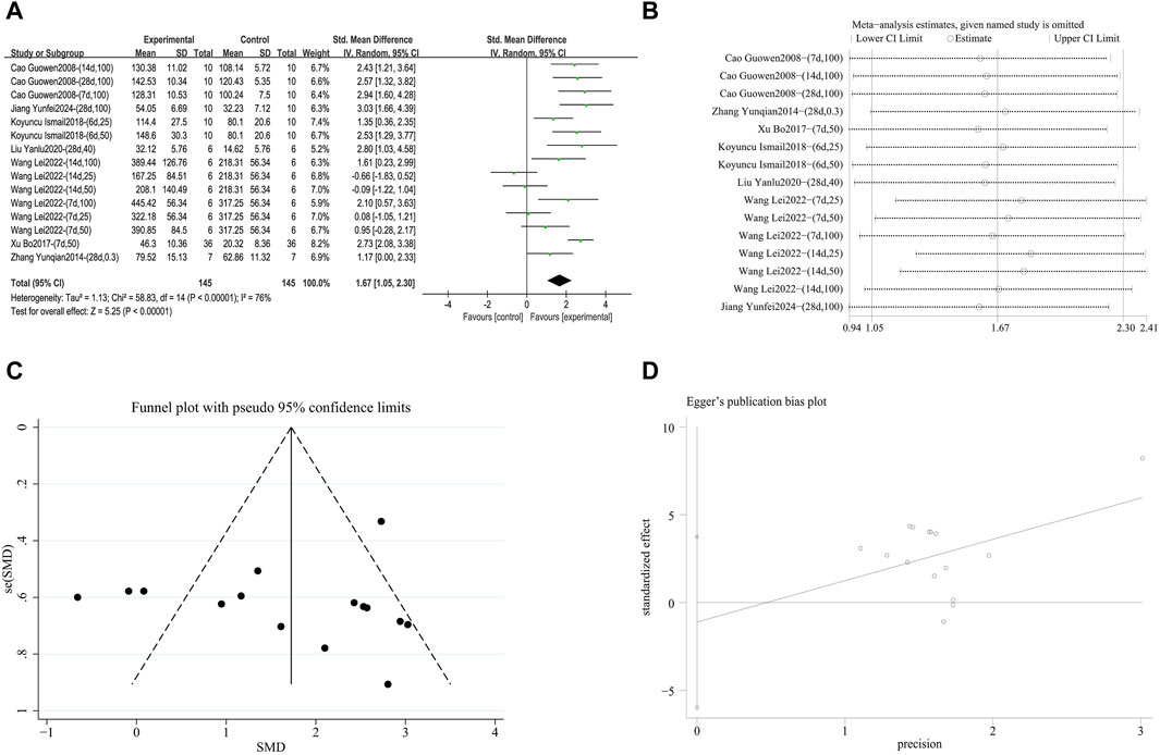 Figure 12. Effect of RES on SOD content in lung tissues of PF animals. (A) Forest plot of SOD content. (B) Sensitivity analysis of SOD content. (C) Funnel plot of SOD content. (D) Egger test for SOD content.