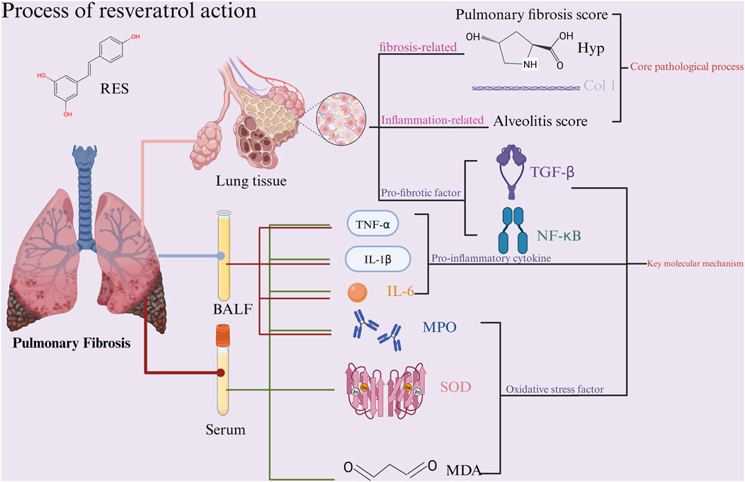 Background: Pulmonary fibrosis (PF) is a chronic lung disease characterized by ongoing interstitial scarring. Current treatments can only slow the progression of the disease. Resveratrol (RES), a natural polyphenolic compound, has become a potential therapy for PF because of its multiple biological effects, including anti-fibrotic, anti-inflammatory, and antioxidant properties.