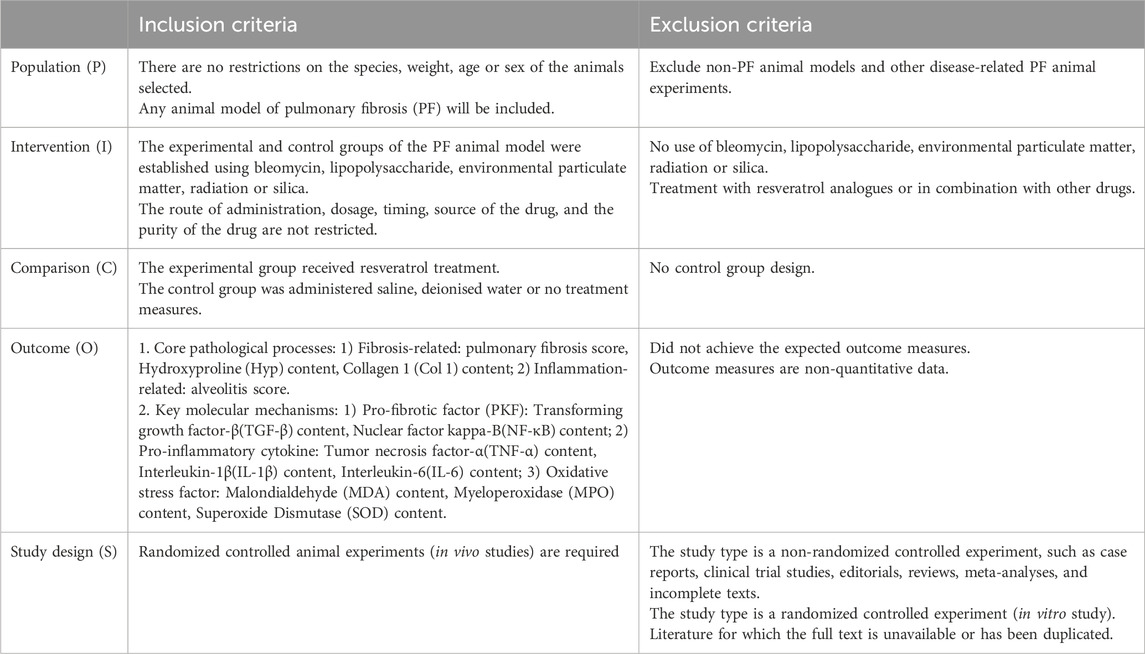 PF is a chronic, progressive, fibrotic interstitial lung disease characterized by increasing scarring of the lung interstitium (Somogyi et al., 2019). Recently, there have been significant advances in treating PF. Pirfenidone and nintedanib are commonly used in clinical practice as antifibrotic therapies (Karimi-Shah and Chowdhury, 2015). While these medications effectively slow lung function decline and disease progression (Biondini et al., 2020), long-term use can cause severe gastrointestinal reactions and liver damage (Kou et al., 2024). Therefore, it is essential to explore new treatment options for PF. Preclinical systematic reviews and meta-analyses of animal studies are valuable tools for assessing clinical efficacy. By analyzing the safety and effectiveness of animal study results, these findings can be further applied to human clinical trials (de Vries et al., 2014). Although numerous preclinical studies have investigated RES in animal models of PF, comprehensive summaries of these studies are limited or incomplete. Additionally, some published articles on the mechanisms of RES treatment for PF lack extensive experimental evidence. A systematic review grounded in evidence-based medicine can help improve animal research quality and facilitate RES therapy translation for PF from preclinical studies to clinical applications.