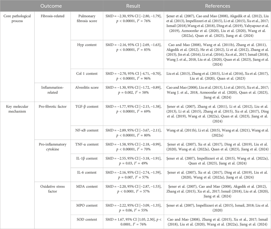 Results: A total of 25 studies were included, involving 628 animals in the experimental groups and 357 animals in the control groups. Meta-analysis of selected outcome measures showed: 1. Improved fibrosis: significant reduction in pulmonary fibrosis score (SMD = −2.30, 95% CI [−2.80, −1.79], p < 0.00001, I2 = 76%) and decreased Hyp content (SMD = −2.16, 95% CI [−2.69, −1.63], p < 0.00001, I2 = 85%); 2. Inhibited inflammation: reduced TNF-α content (SMD = −1.58, 95% CI [−2.18, −0.99], p < 0.00001, I2 = 70%) and decreased IL-6 content (SMD = −2.16, 95% CI [−2.74, −1.59], p = 0.007, I2 = 57%); 3. Restored oxidative balance: decreased MDA content (SMD = −2.22, 95% CI [−3.09, −1.35], p = 0.06, I2 = 55%) and increased SOD content (SMD = 1.67, 95% CI [1.05, 2.30], p < 0.0001, I2 = 76%).