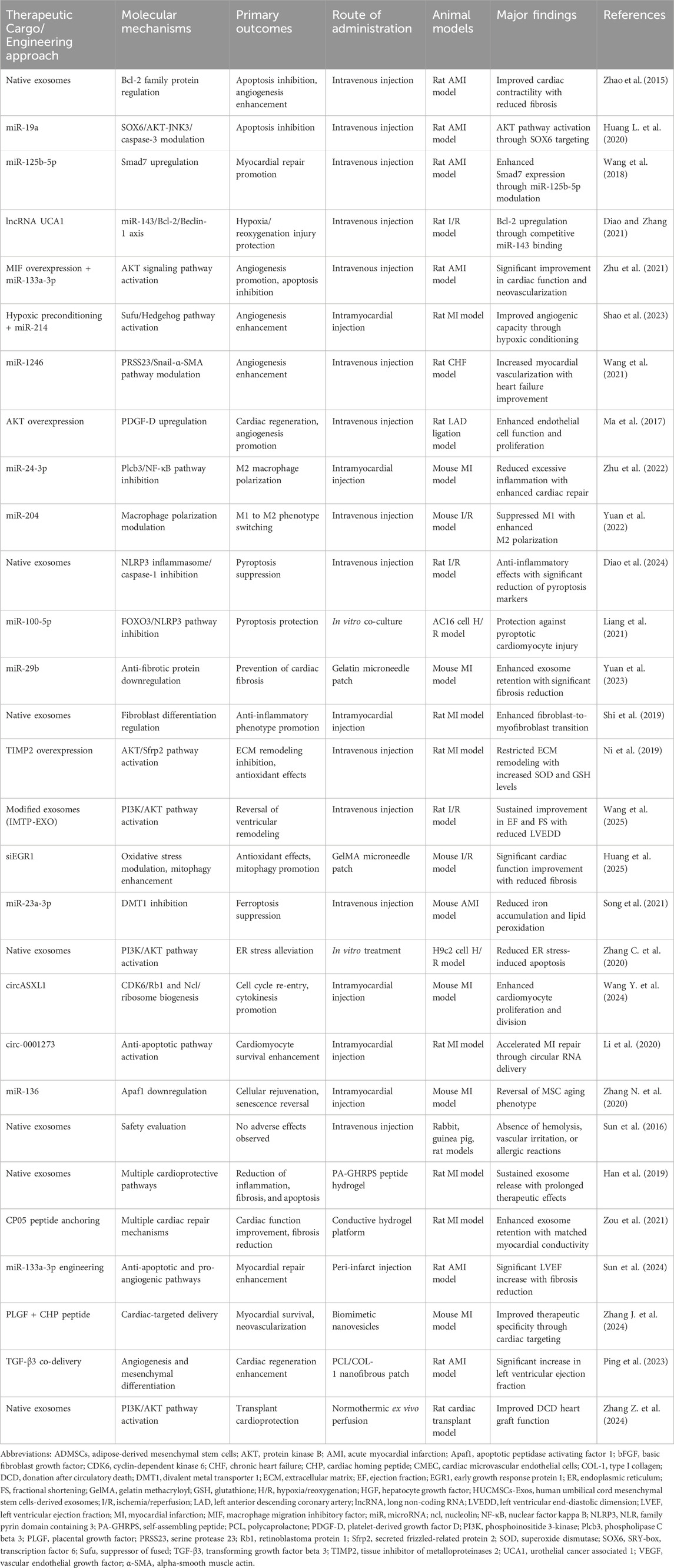 Tissue inhibitor of metalloproteinases 2 (TIMP2)-engineered HUCMSCs produce exosomes with enhanced anti-remodeling properties through the AKT/secreted frizzled-related protein 2 (Sfrp2) pathway, effectively restricting extracellular matrix remodeling and reducing collagen deposition (Ni et al., 2019). These exosomes demonstrate enhanced therapeutic potential in preventing adverse cardiac remodeling while promoting beneficial tissue reorganization. Long-term studies demonstrate that HUCMSCs-Exos can reverse ventricular remodeling and improve cardiac function through sustained anti-fibrotic effects. These findings further extend both the duration and scope of HUCMSCs-Exos therapeutic applications (Wang et al., 2025).