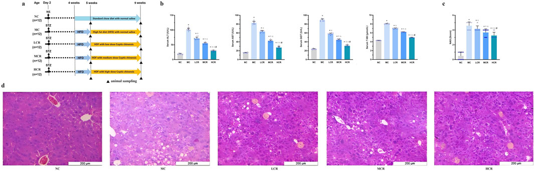 The experimental design is shown in Figure 1a. Sixty specific pathogen-free (SPF) male C57BL/6 J mice pups were obtained from the Experimental Animal Center of Lanzhou University (Lanzhou, China). According to previous research (Fujii et al., 2013), twelve mice were assigned to the normal control group (NC) and received subcutaneous injections of 0.9% normal saline (NS: 20 μL/head) at 2 days of age, followed by a normal chow diet after weaning at 4 weeks, and were maintained throughout the experimental period. The remaining 48 mice were injected with STZ (200 μg/20 μL/head, subcutaneously) at 2 days of age and fed an HFD after weaning at 4 weeks to induce the T2DM-related MASH model and maintained throughout the experimental period.