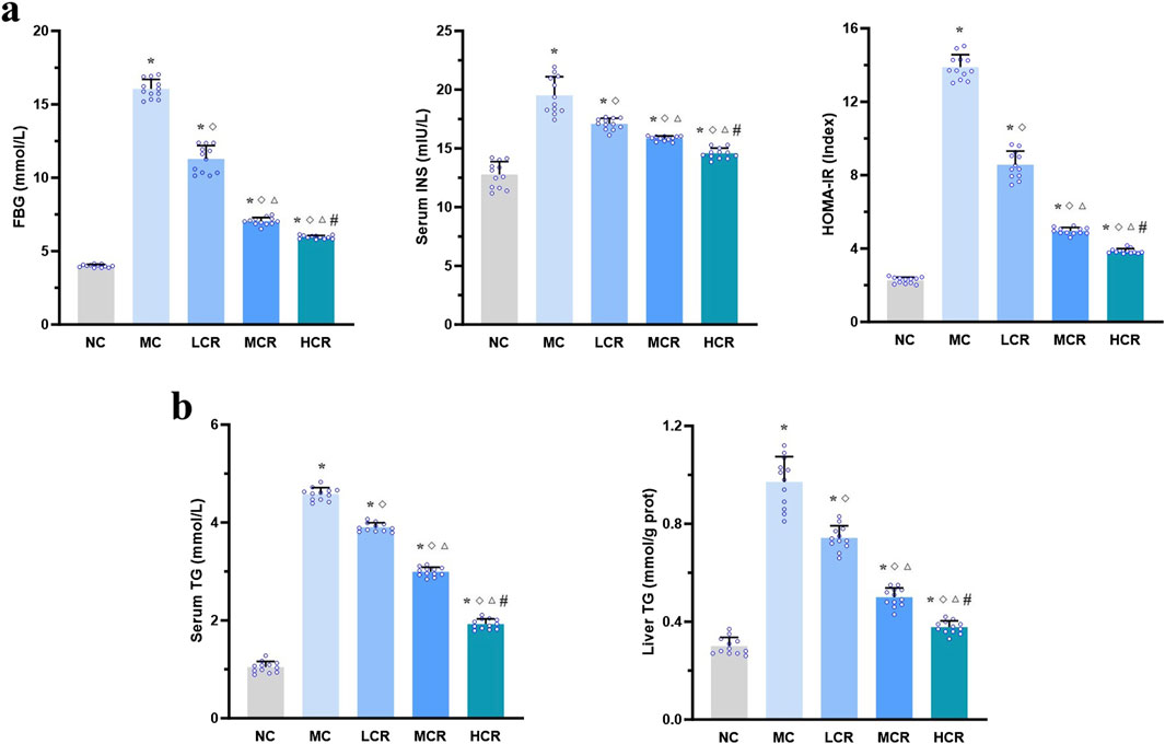 Figure 2. Coptidis rhizoma improved glucose and lipid metabolism disturbances in T2DM-related MASH mice. (a) Characteristics of glucose metabolism and insulin resistance. (b) Characteristics of lipid metabolism. Data are presented as the mean ± SEM. *p < 0.001 vs. NC; ◇ p < 0.001 vs. MC; Δ p < 0.001 vs. LCR; #p < 0.001 vs. MCR. Abbreviations for treatment groups: NC, normal control; MC, model control; LCR, low-dose Coptidis rhizoma; MCR, medium-dose Coptidis rhizoma; HCR, high-dose Coptidis rhizoma. Abbreviations for parameters: FBG, fasting blood glucose; INS, insulin; HOMA-IR, homeostasis model assessment of insulin resistance; TG, triglyceride.