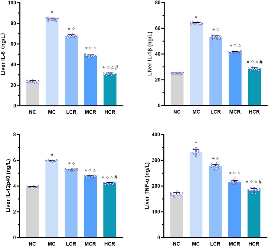 As shown in Figure 3, the hepatic levels of pro-inflammatory cytokines, including IL-6, IL-1β, IL-12p40, and TNF-α, were significantly higher in the MC group than in the NC group (all p < 0.001). Treatment with Coptidis rhizoma markedly decreased the levels of these cytokines (all p < 0.001). A clear dose-dependent reduction was also observed in the LCR, MCR, and HCR groups (all p < 0.001).