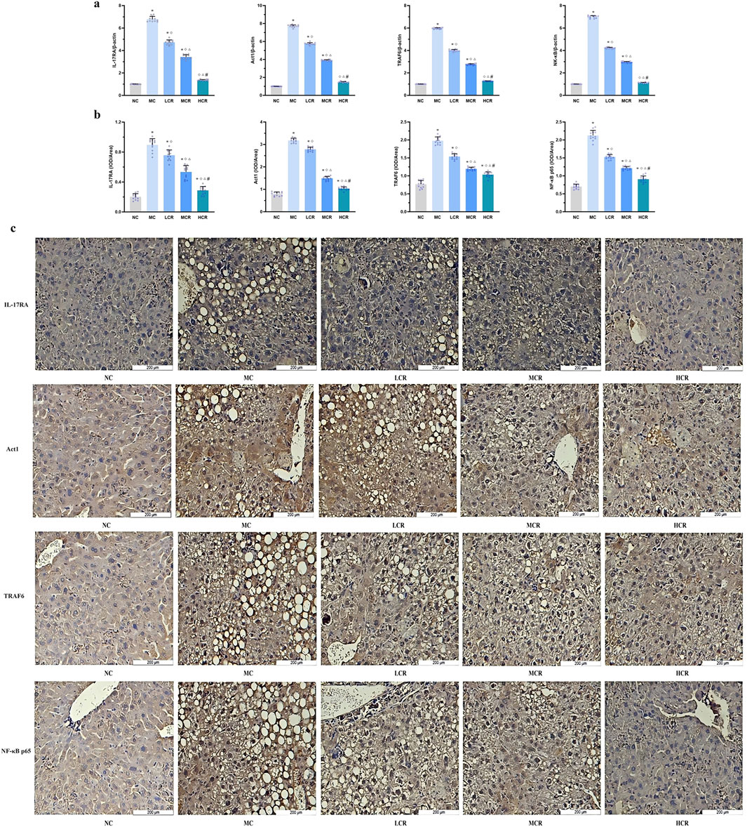 Figure 4. Coptidis rhizoma downregulated the IL-17RA/NF-κB signaling pathway in the liver of T2DM-related MASH mice. (a) mRNA expression of IL-17RA/NF-κB signaling pathway in the liver tissue. (b) Statistical graph using the integrated optical density value/area. (c) Representative images of IL-17RA/NF-κB signaling pathway expression detected by immunohistochemistry, in which positive staining was shown in brown. Data are presented as the mean ± SEM. *p < 0.001 vs. NC; ◇ p < 0.005 vs. MC; Δ p < 0.05 vs. LCR; #p < 0.05 vs. MCR. Abbreviations for treatment groups: NC, normal control; MC, model control; LCR, low-dose Coptidis rhizoma; MCR, medium-dose Coptidis rhizoma; HCR, high-dose Coptidis rhizoma. Abbreviations for parameters: IL-17RA, interleukin 17 receptor A; Act1, nuclear factor kappa B activator 1, TRAF6, tumor necrosis factor receptor-associated factor 6; NF-κB, nuclear factor kappa B; NF-κB p65, nuclear factor kappa B p65; IOD, integrated optical density.