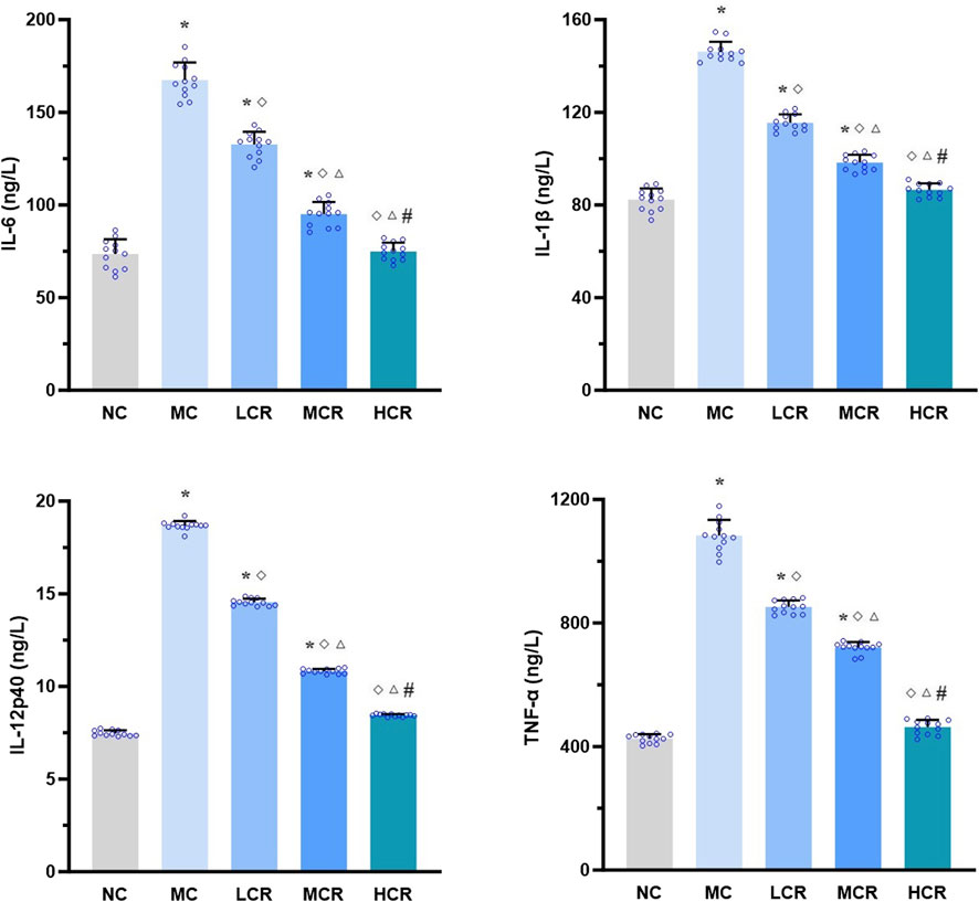 Figure 3. Coptidis rhizoma reduced pro-inflammatory cytokine levels in the liver of T2DM-related MASH mice. Data are presented as the mean ± SEM. *p < 0.001 vs. NC; ◇ p < 0.001 vs. MC; Δ p < 0.001 vs. LCR; #p < 0.001 vs. MCR. Abbreviations for treatment groups: NC, normal control; MC, model control; LCR, low-dose Coptidis rhizoma; MCR, medium-dose Coptidis rhizoma; HCR, high-dose Coptidis rhizoma. Abbreviations for parameters: IL-6, interleukin 6; IL-1β, interleukin 1 beta; IL-12p40, interleukin 12 P40; TNF-α, tumor necrosis factor alpha.